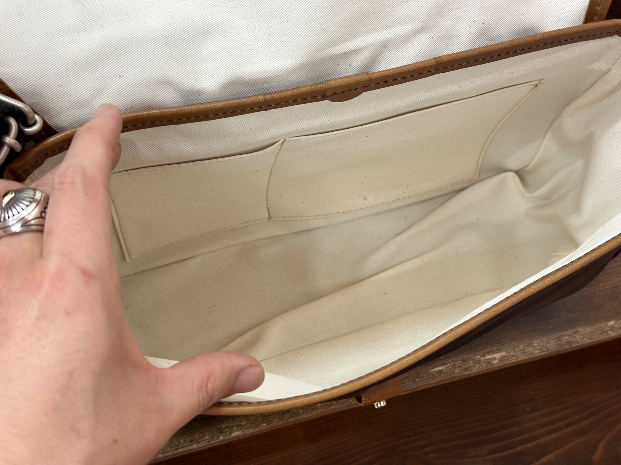 フラップを開けると大容量収納部分と、サイズよ異なる内ポケットが2ヶ所あり、スマホやタバコなど収納可能。