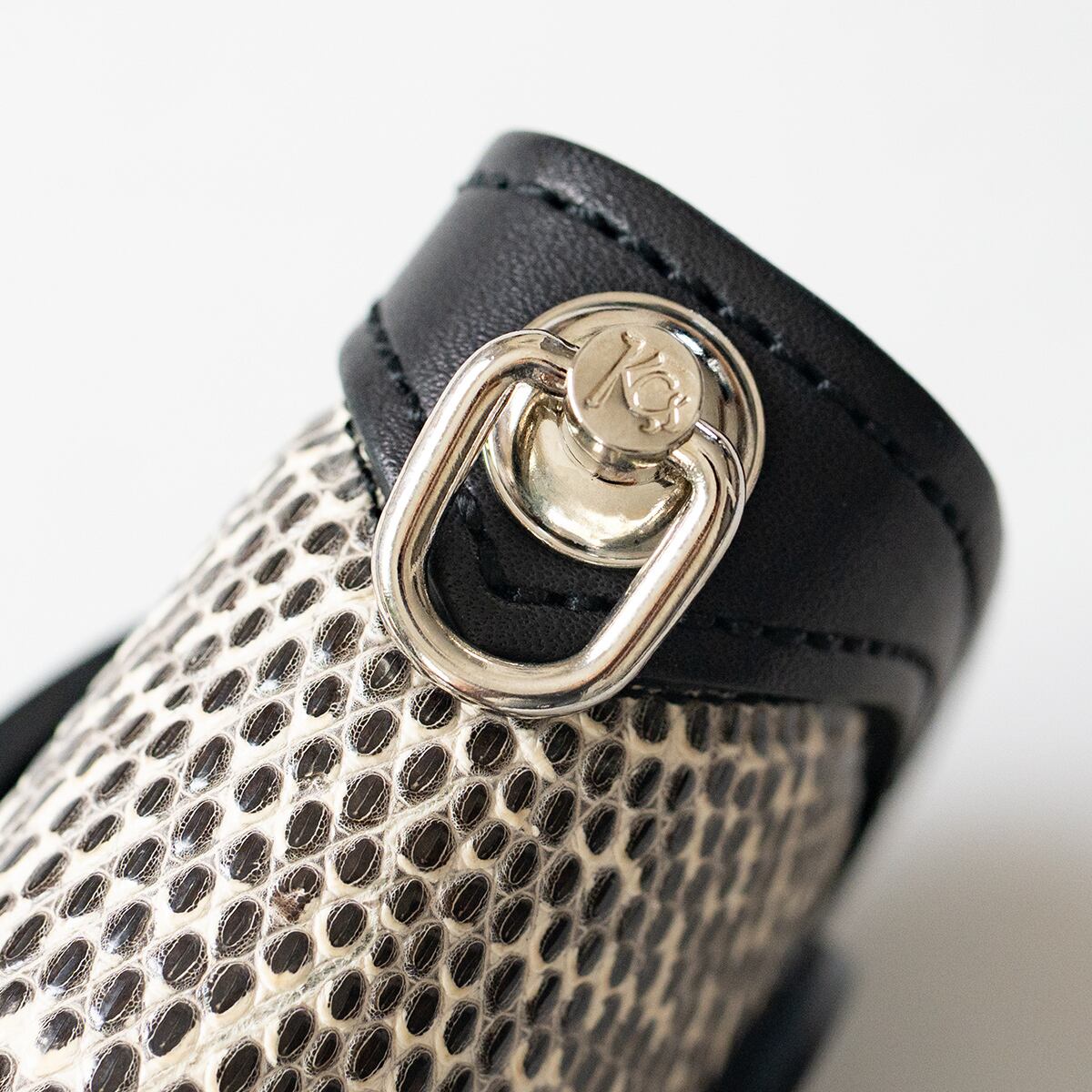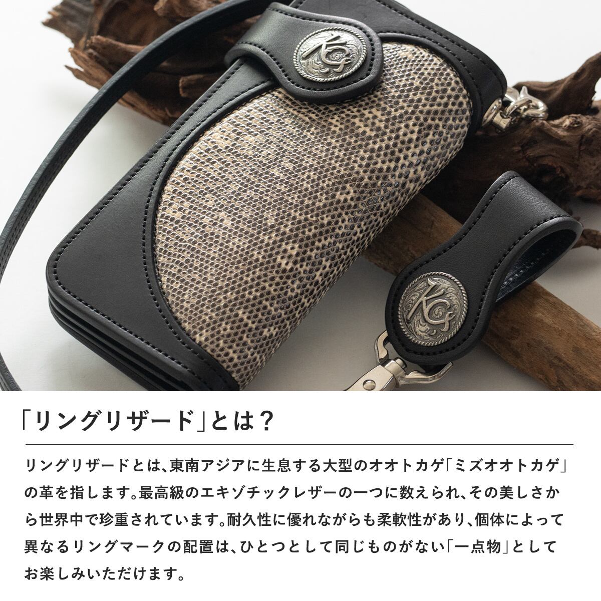 リングリザードは、特徴的な鱗模様に“リング(輪)状の斑点模様”があり、この「リング模様」が名前の由来になっており、他のリザードレザーと比べても視覚的に個性が強く、美しく、希少性が高いとされています。