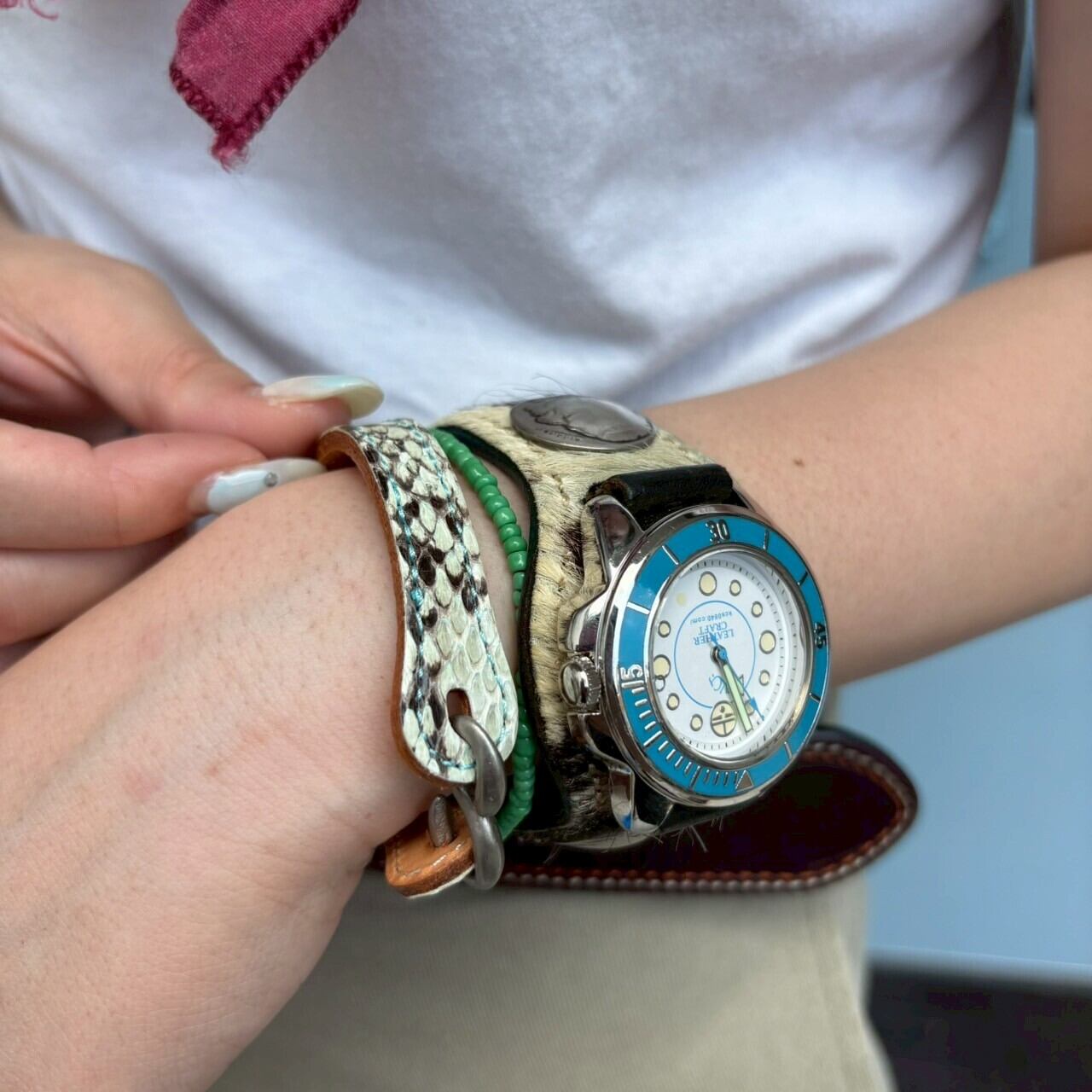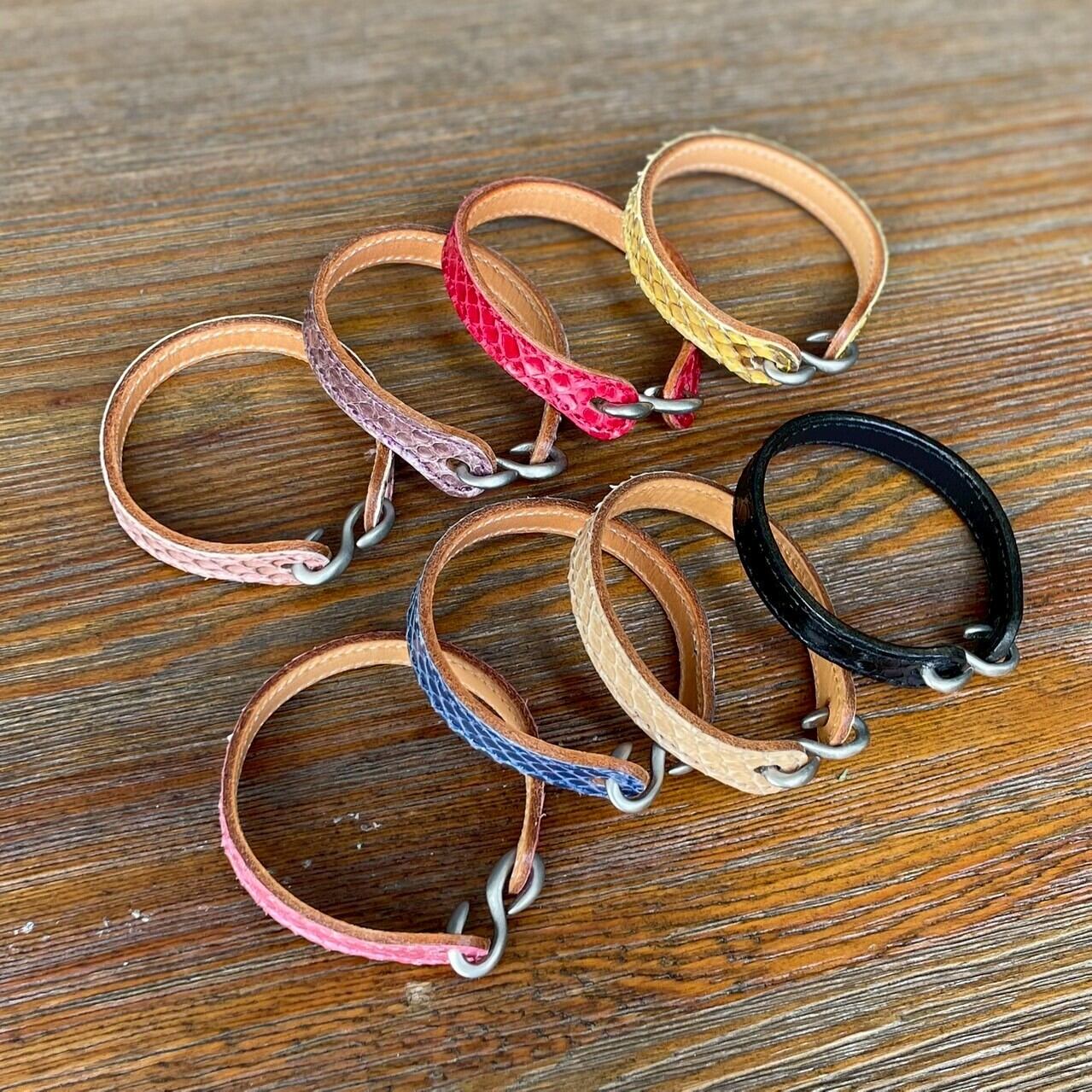 どんな服装にも、カラフルなパイソン革がアクセントで目を惹く、
