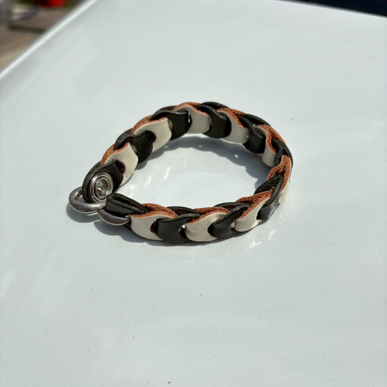手作業で40枚の革を丁寧に連結したブレスレットは、どんなスタイルにもマッチし、独特の存在感を放ちます。