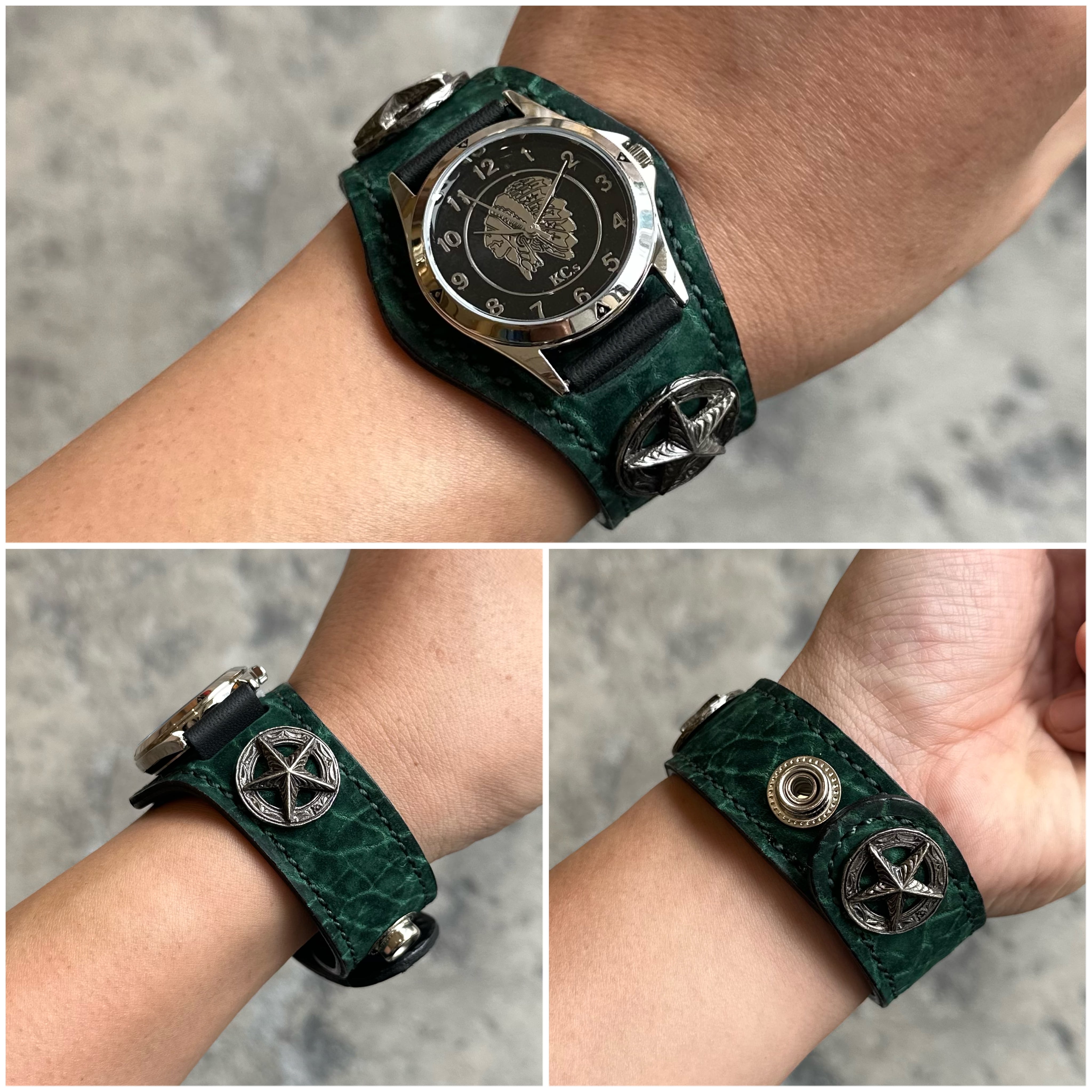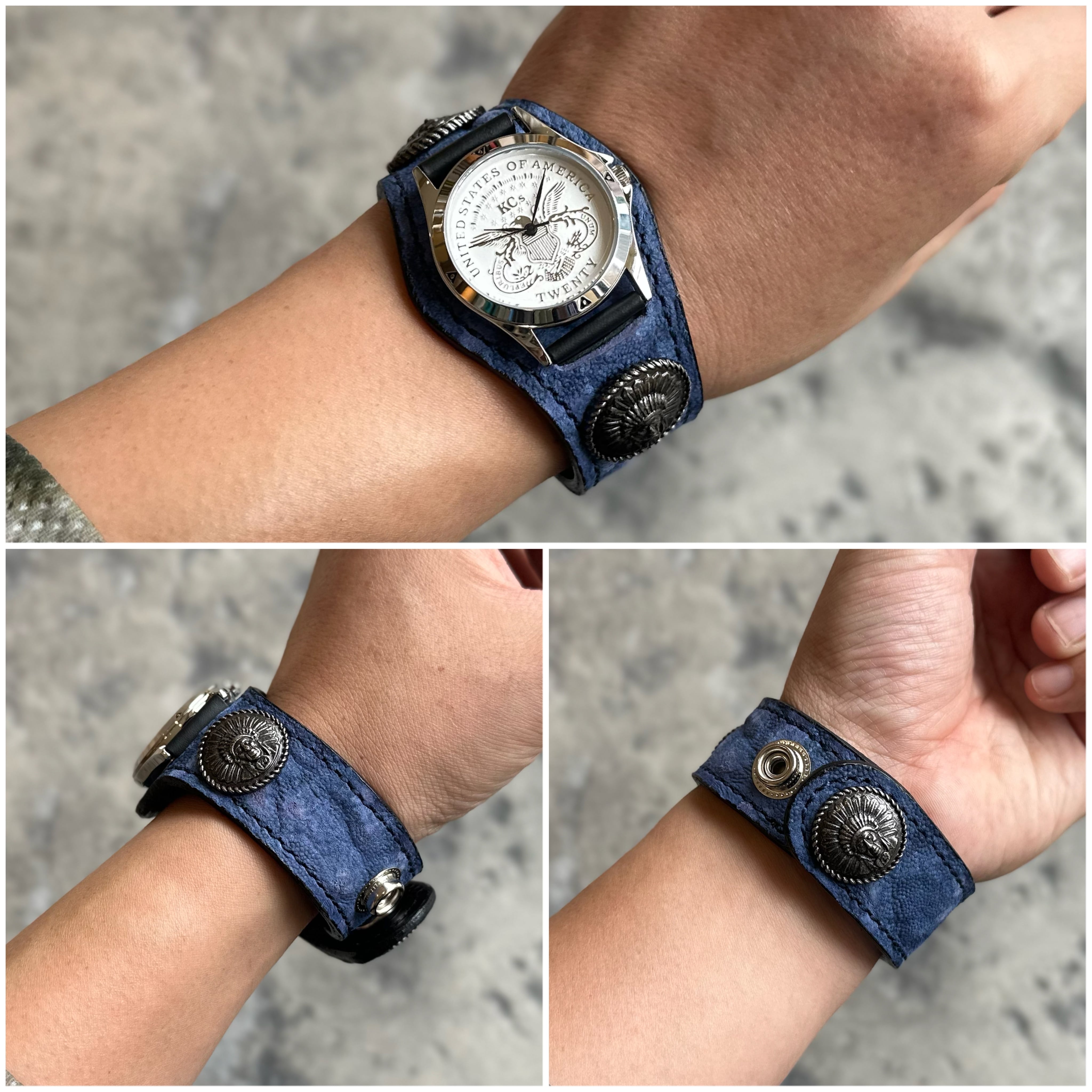 3つの配置されたコンチョが重厚なアクセントになり、ブレスレット感覚でも楽しめます。