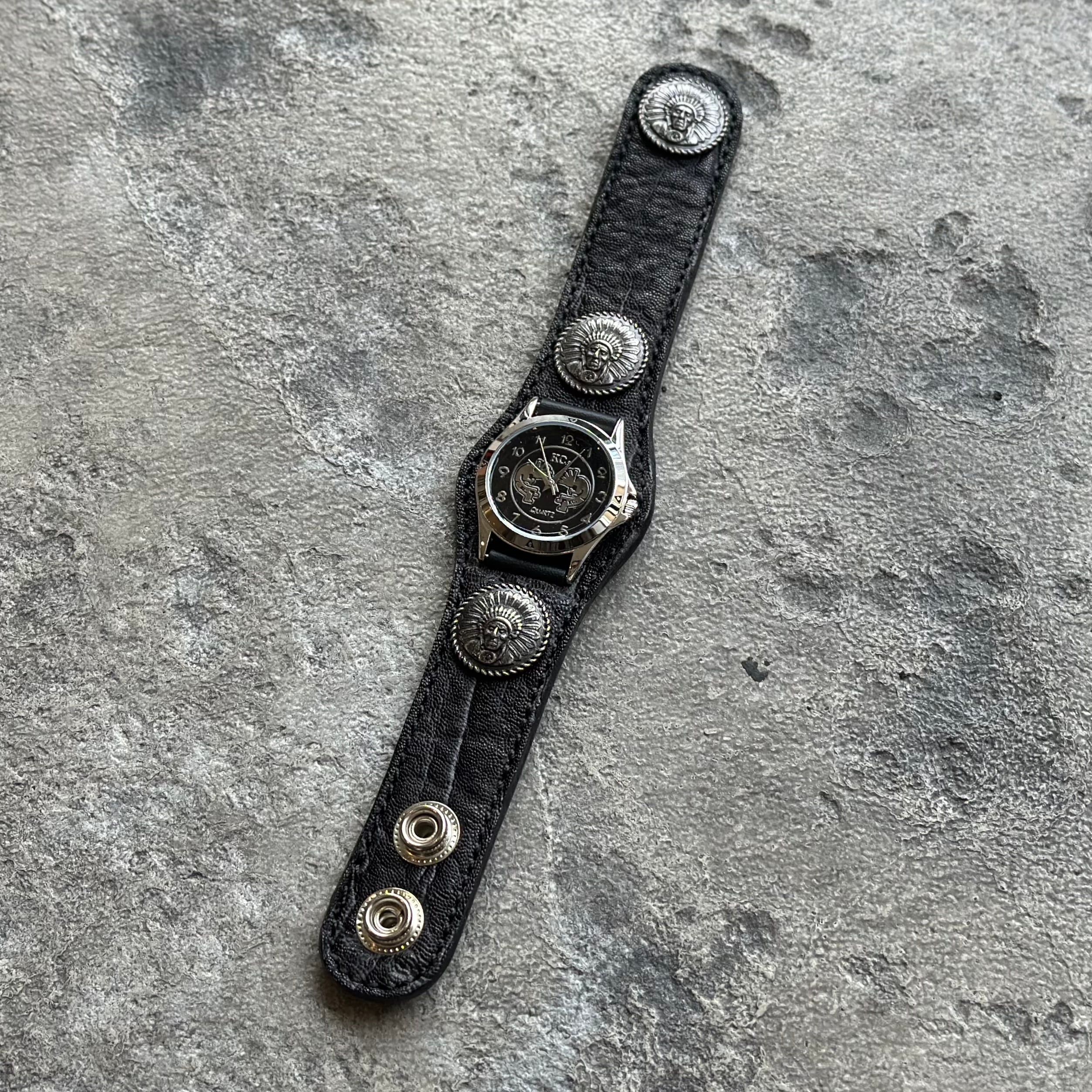 ブレス全体に並ぶ3つのコンチョが、エレファント革の重厚さを引き締めるデザイン。