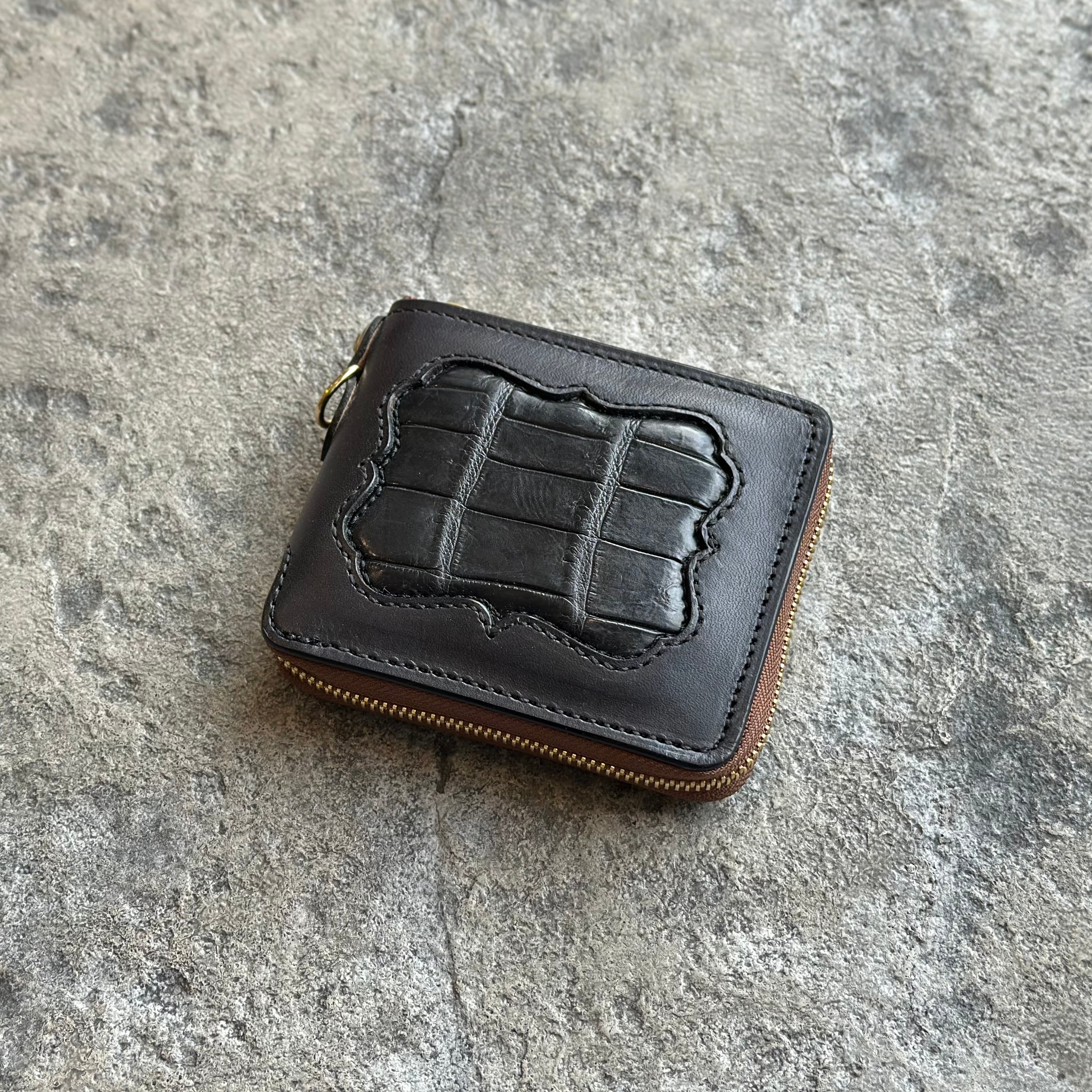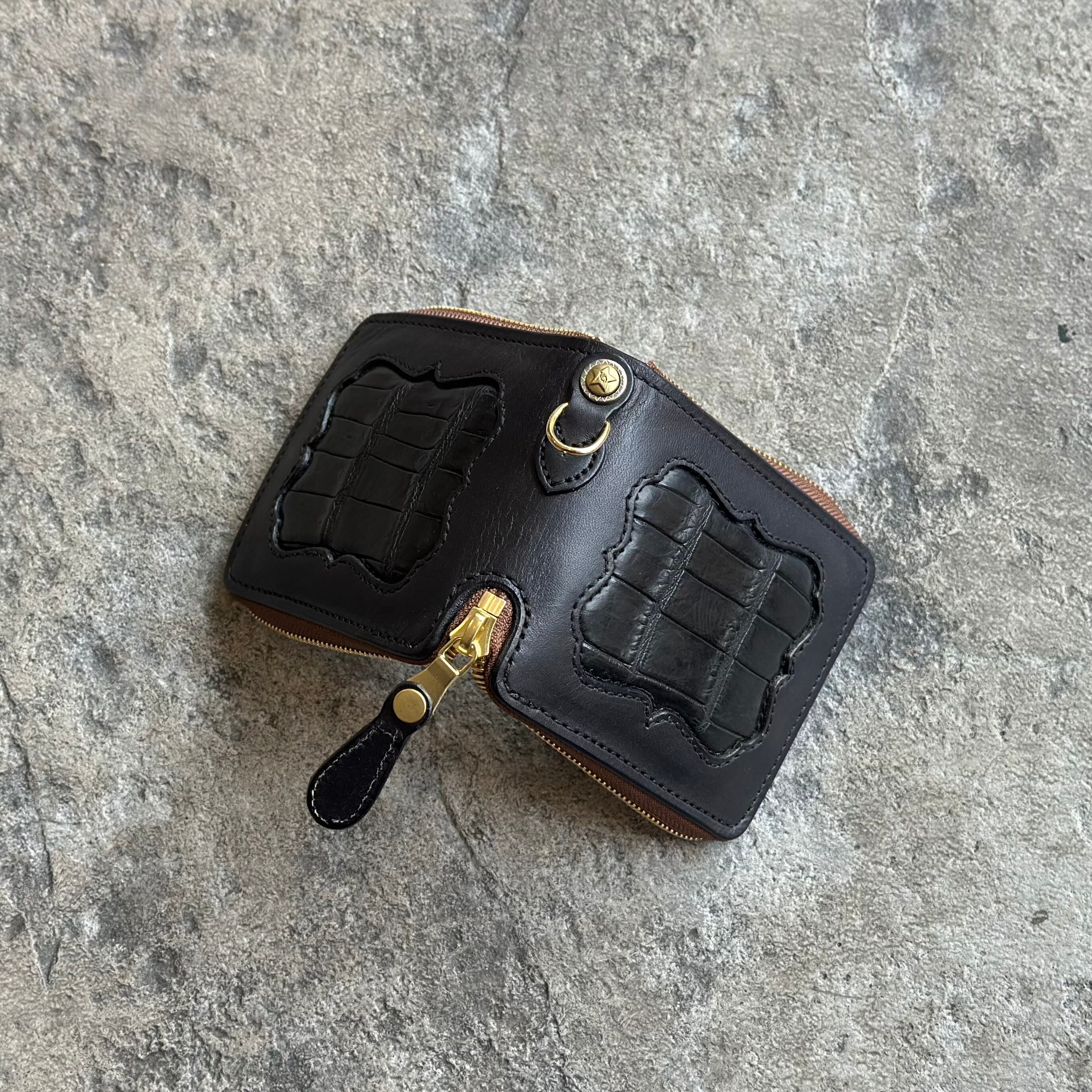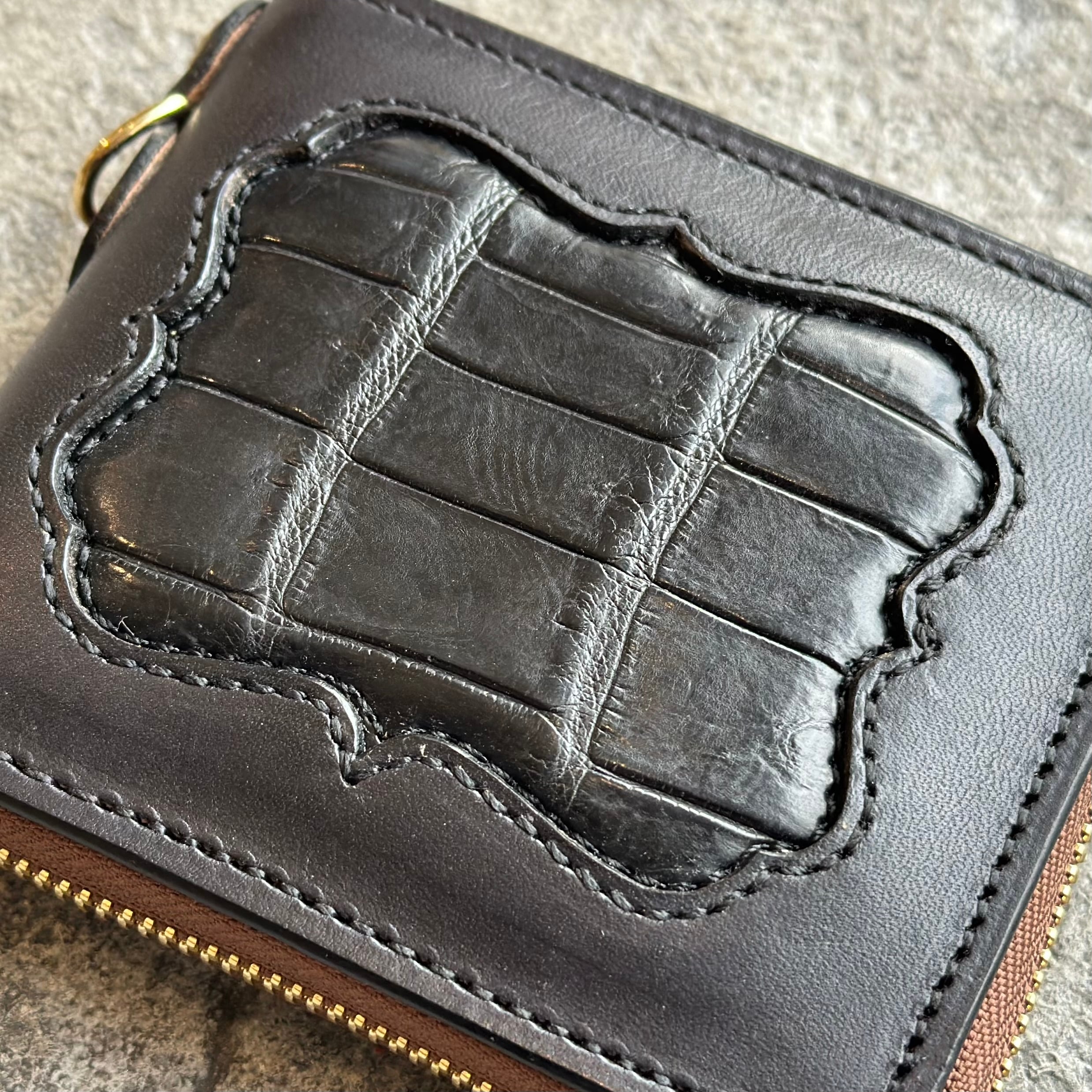 上質なイタリアンカンパーニュレザー(牛革)にクロコダイルをインレイ技法にて仕上げたビルフォールドラウンドジップ。