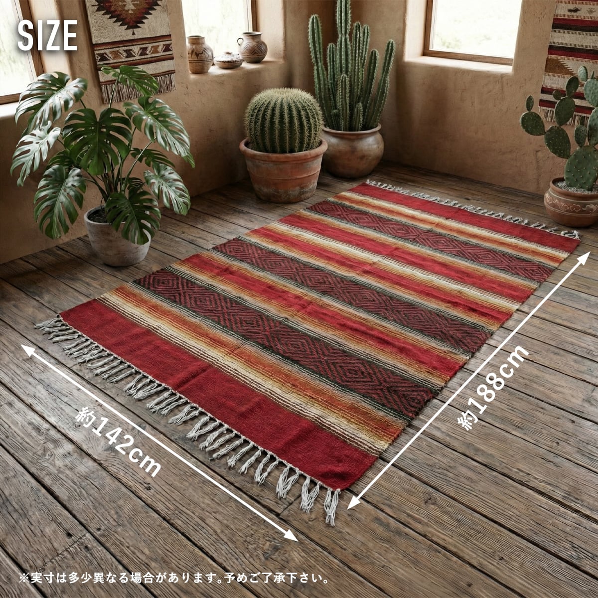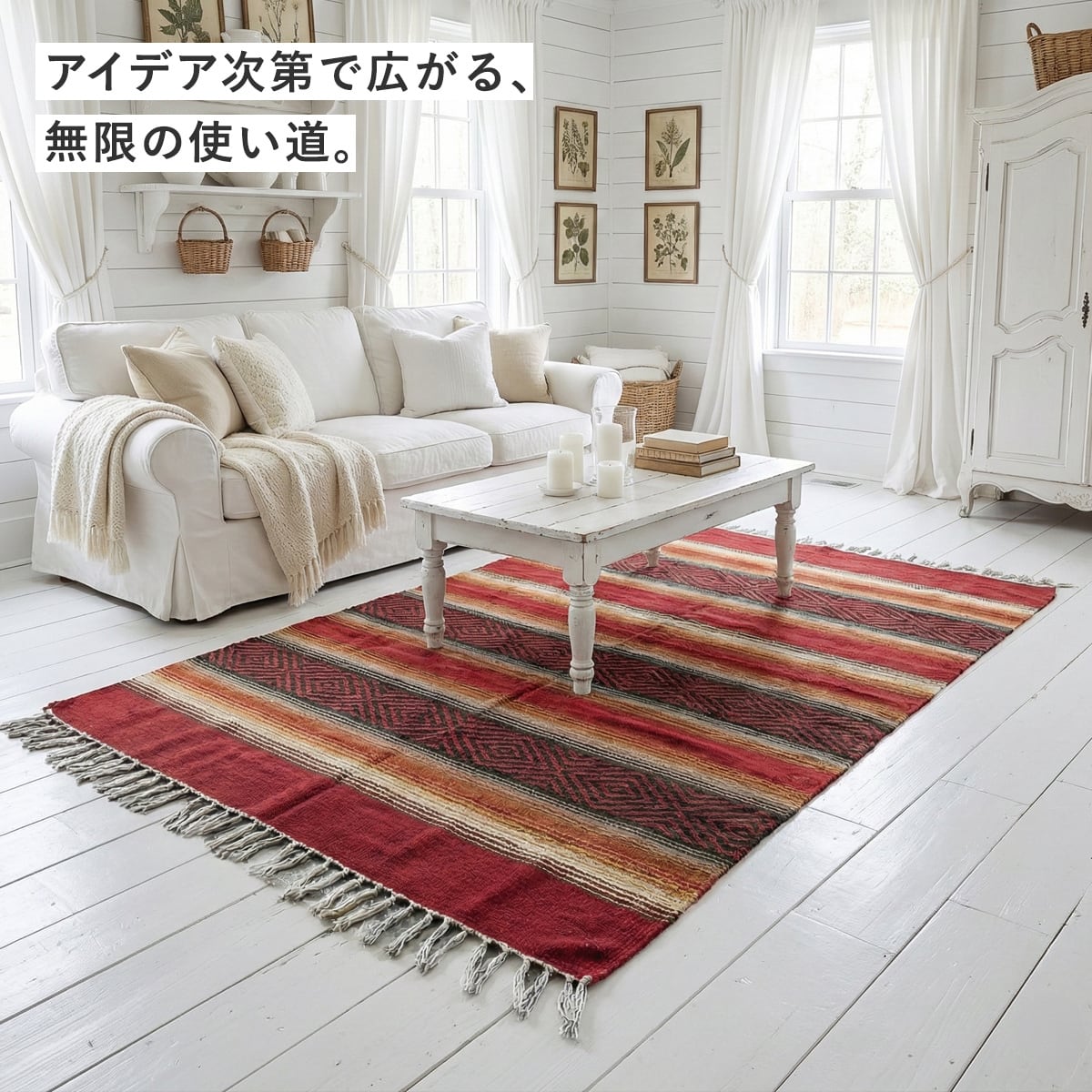 色鮮やかな幾何学模様が最大の特徴。敷くだけで空間のアクセントになり、西海岸風、ヴィンテージ、アメカジテイストのインテリアと相性抜群です。