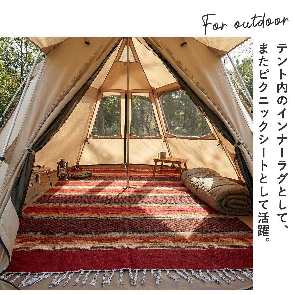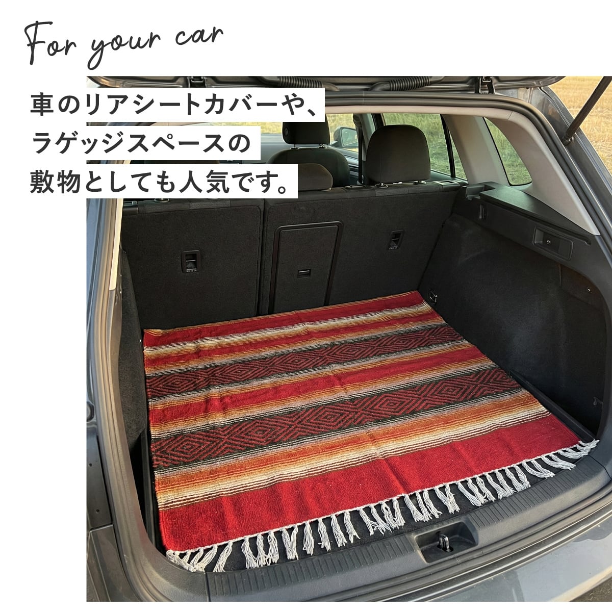 リビングのラグマットやソファカバー、ベッドスローとしての室内利用はもちろん、キャンプやグランピングでのテントラグ、車のシートカバーなど、アウトドアシーンを彩るアイテムとしても絶大な人気を誇ります。