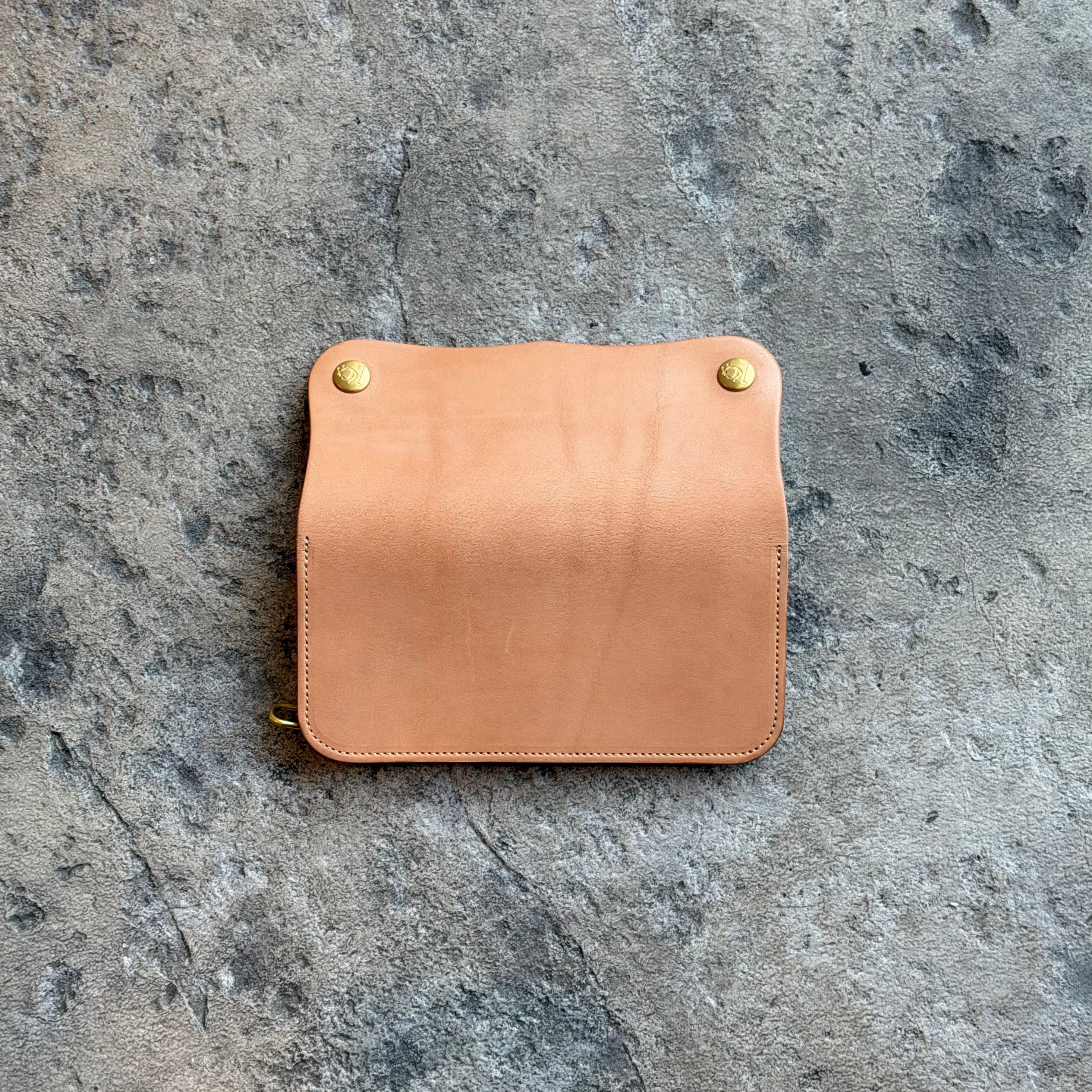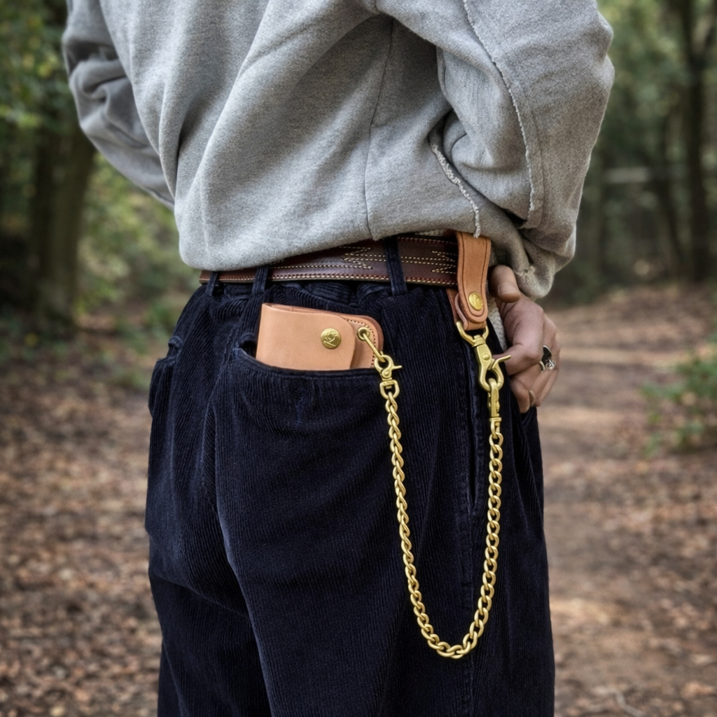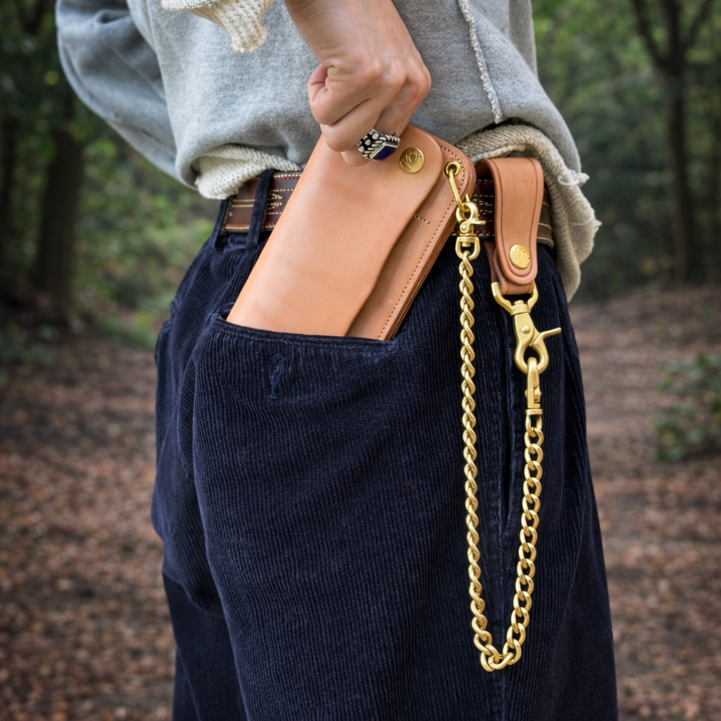 ウォレットチェーンはもちろん、ボタンやナスカンに至るまで、全てブラス製(真鍮)にこだわりました。ブラスは使い始めの輝きから一転、時間と共に酸化し、深く落ち着いた重厚な雰囲気を纏います。レザーと共に、金属パーツも変化を遂げることで、全体から醸し出されるオーラがより一層、無骨でタフな印象を強めます。付属品として、ウォレットチェーンとキーリングがセットになっています。