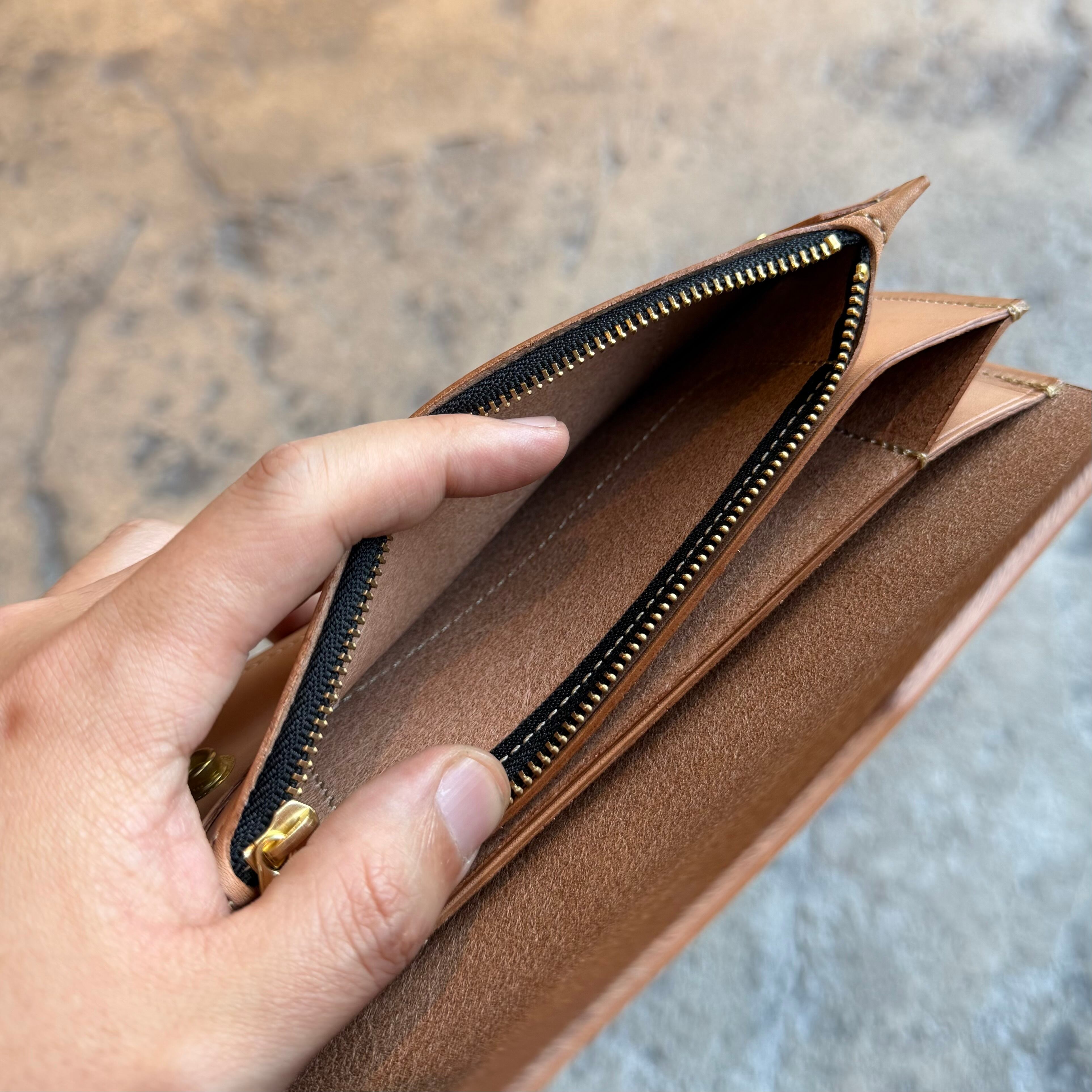 素材には、このトラッカーウォレットのためだけに特別に制作した、KC,sオリジナルの栃木レザーを使用。厚口でたっぷりとオイルを含んだ革は、使い込むほどに深い色艶と重厚な質感へと変化します。この極上の経年変化(エイジング)こそが、サベージの真骨頂。使えば使うほどライフスタイルが刻み込まれ、世界に一つだけの相棒へと進化します。