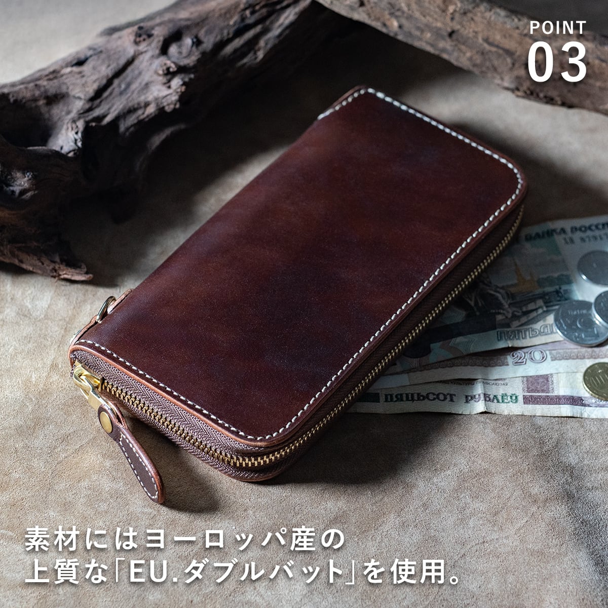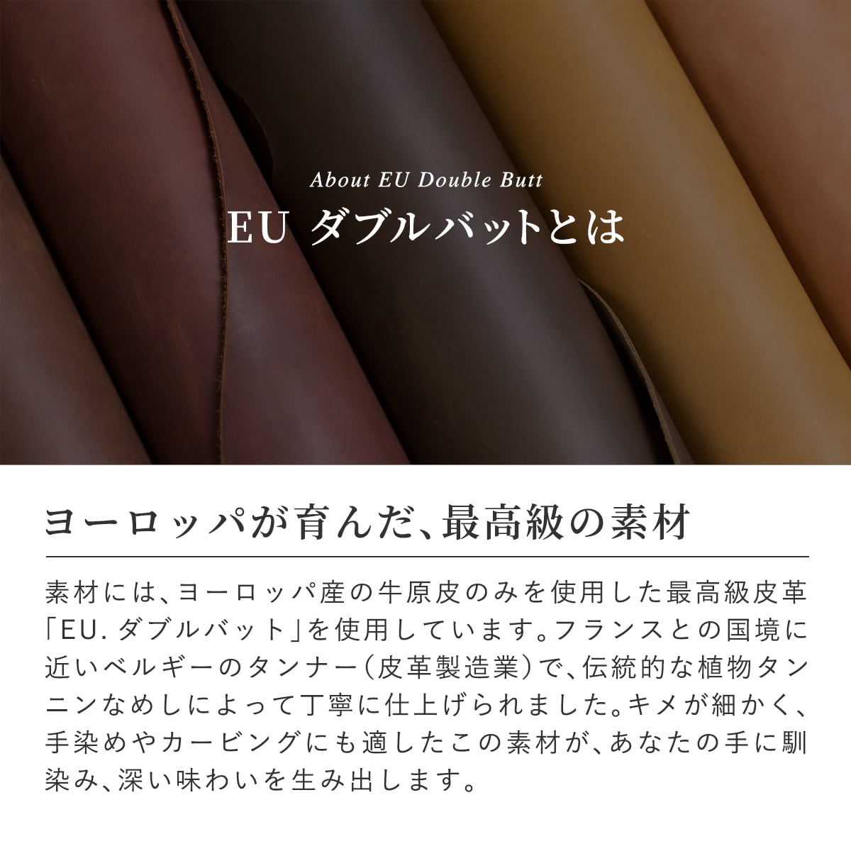 素材のEU.ダブルバット(牛皮革)はヨーロッパ産の牛原皮のみを使用し、
