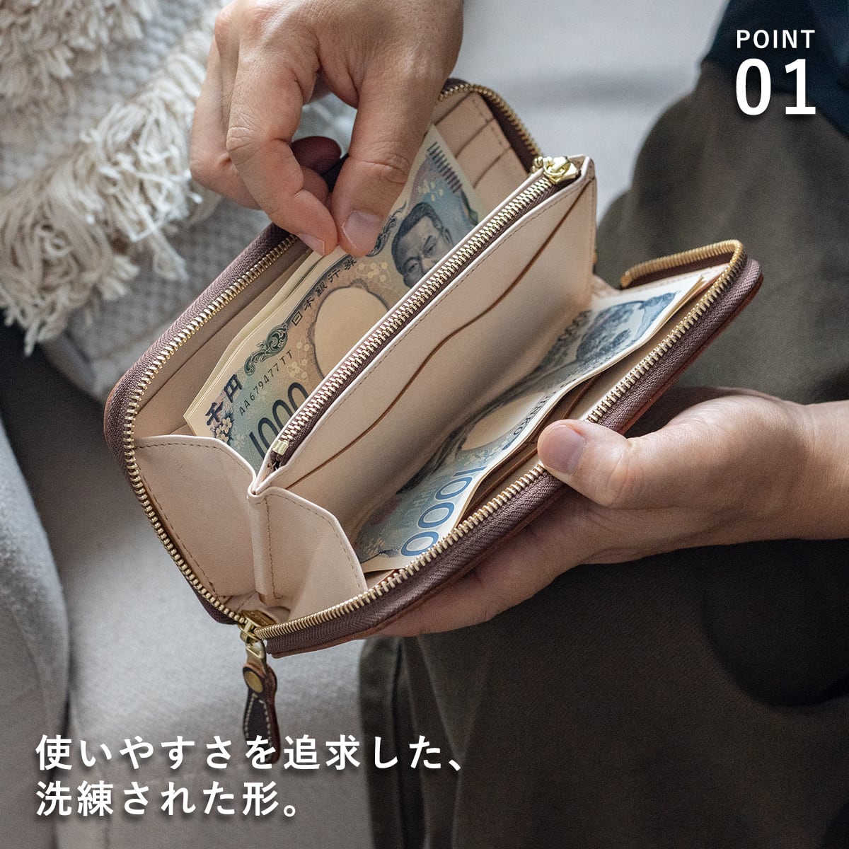お札・小銭・カードの出し入れが容易に出来る構造がとても便利で使いやすくなっています。