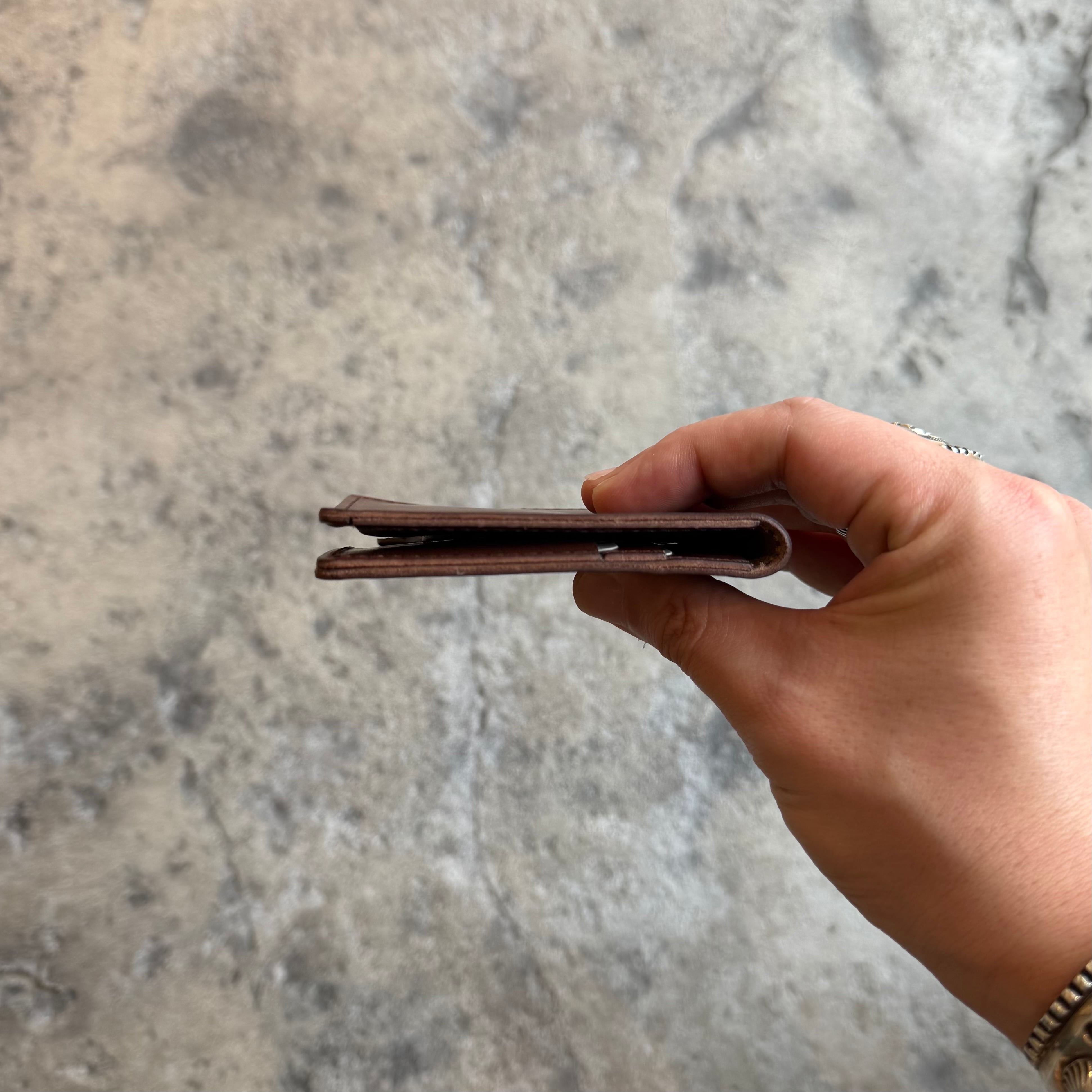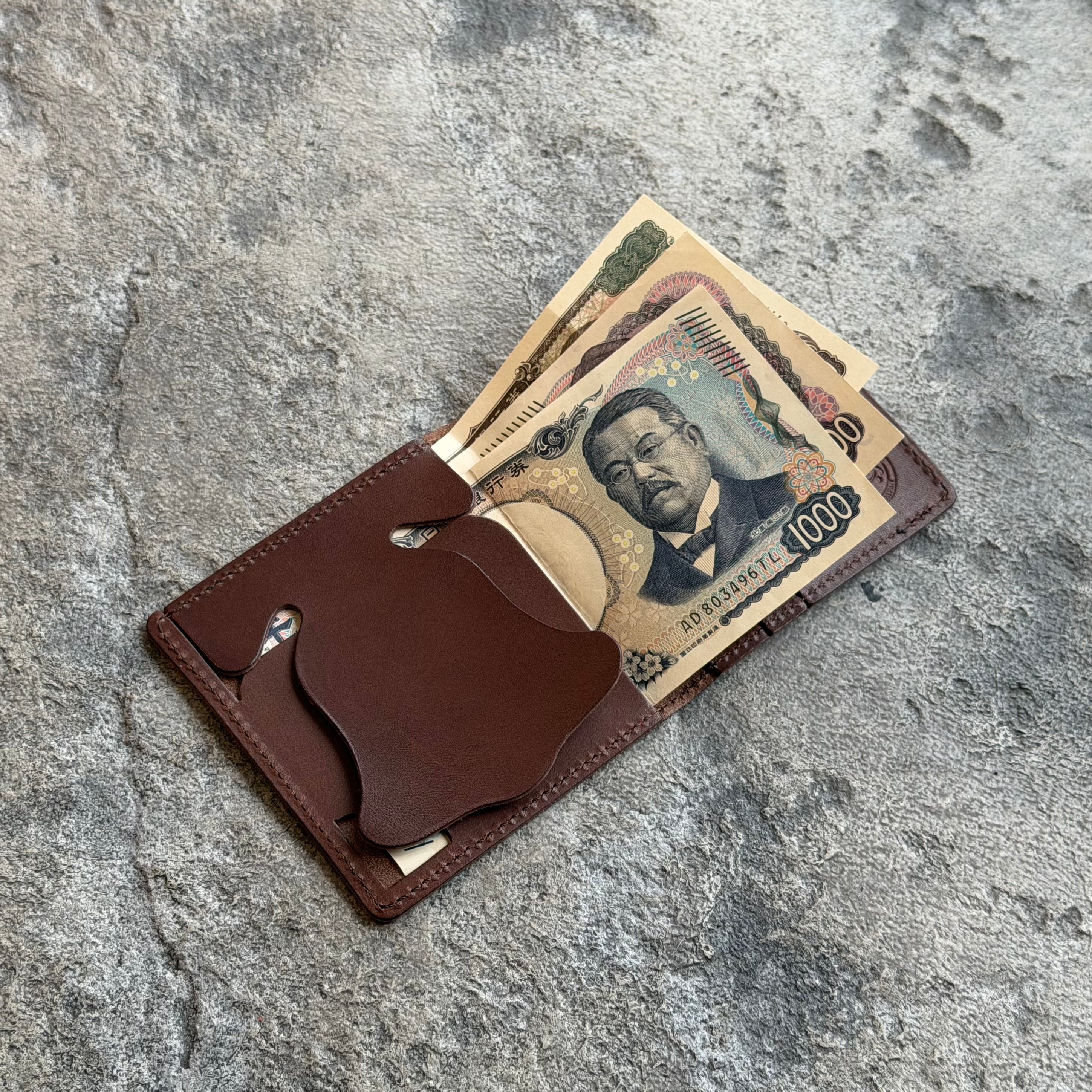 カードホルダーが2つとカードホルダーの裏にポケットがあり、小銭入れは無く、お札を挟んで収納できるポケットがあります。