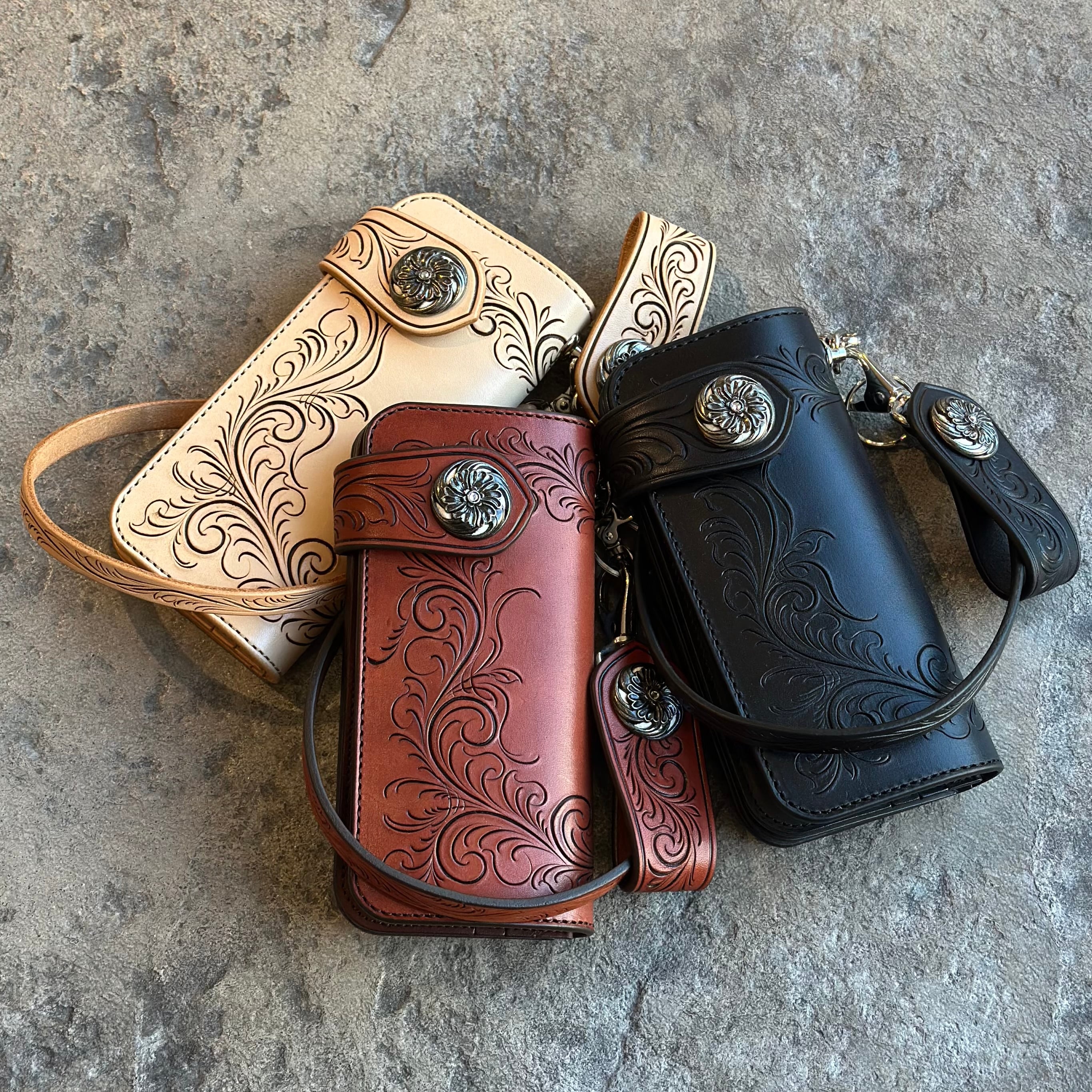 職人が1つ1つ丁寧にカービングで描いたロングウォレットです。
