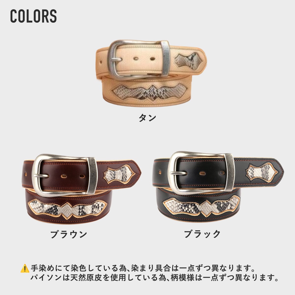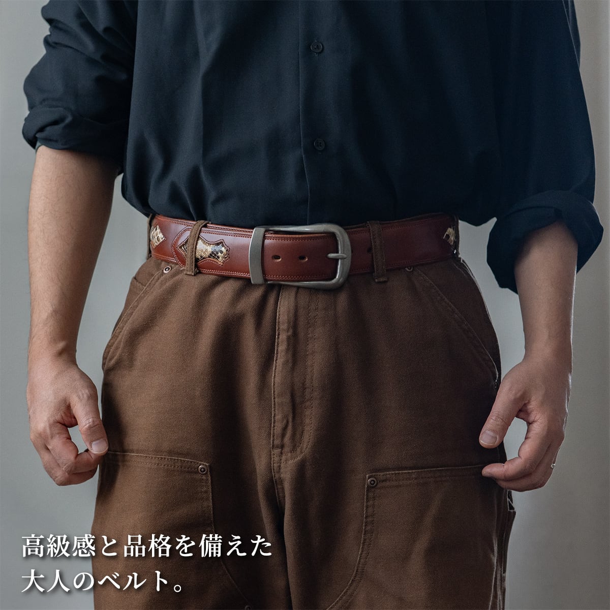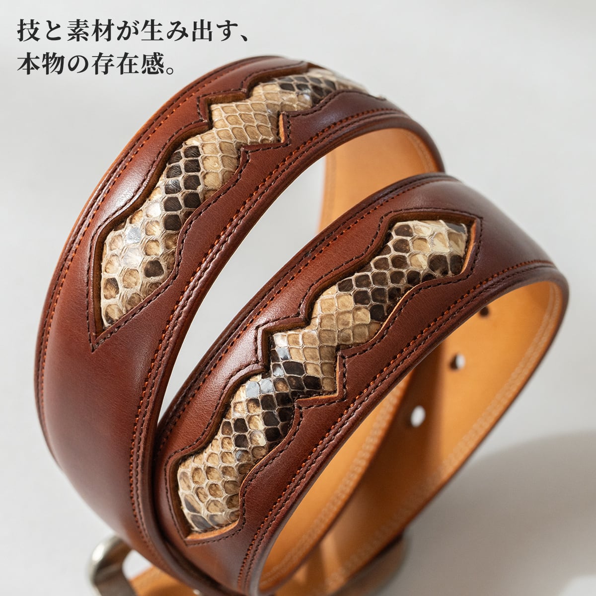 生産は日本国内で行われ、外革には上質な牛革、インレイ部分には存在感のあるパイソン素材を使用。際縫いには国産#5番スパン糸を用い、2重ステッチで強度とデザイン性を高めています。カラーはタン、ブラウン、ブラックの3色展開。サイズはサイズ表をご確認いただけます。クラフトマンシップが息づく、長く愛用できる本格レザーベルトです。