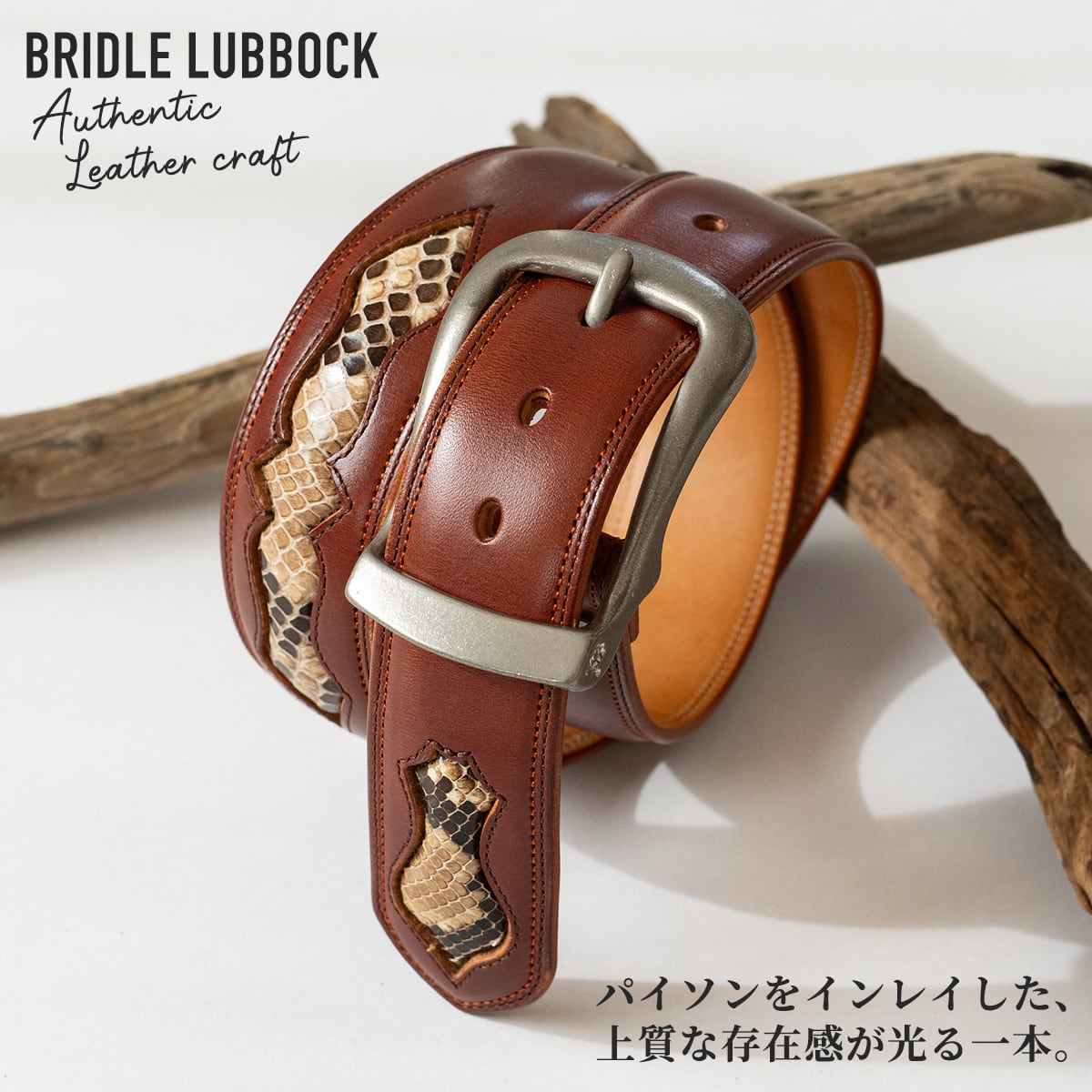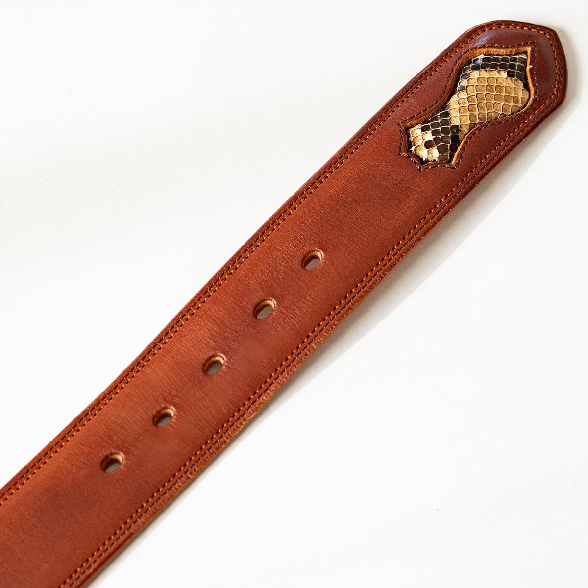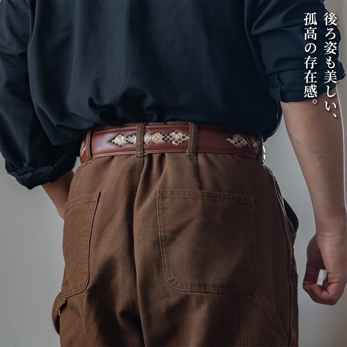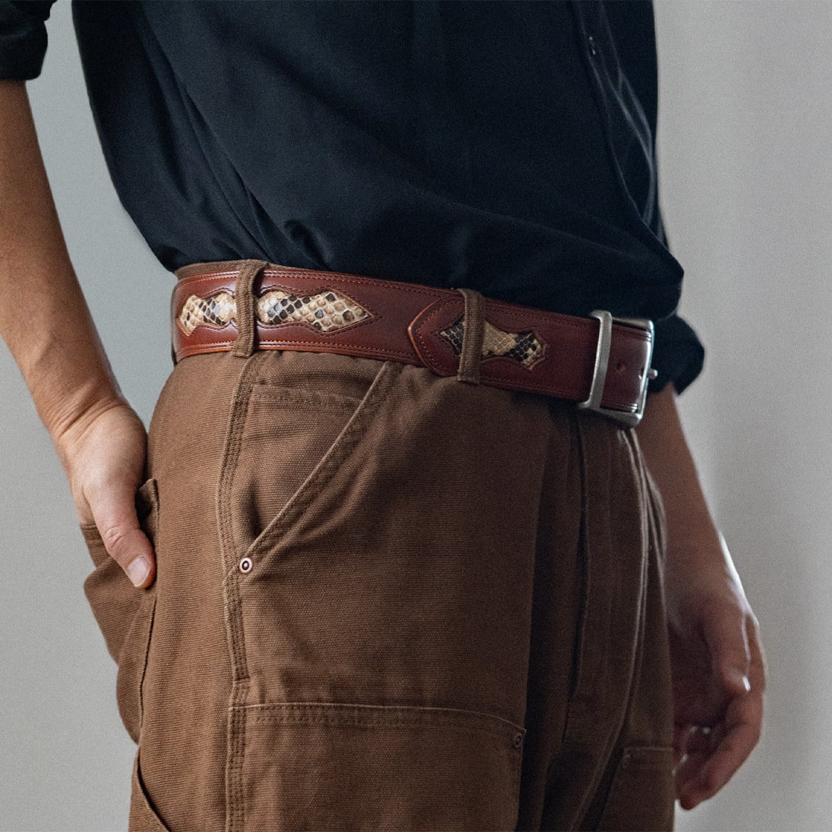 生産は日本国内で行われ、外革には上質な牛革、インレイ部分には存在感のあるパイソン素材を使用。際縫いには国産#5番スパン糸を用い、2重ステッチで強度とデザイン性を高めています。カラーはタン、ブラウン、ブラックの3色展開。サイズはサイズ表をご確認いただけます。クラフトマンシップが息づく、長く愛用できる本格レザーベルトです。