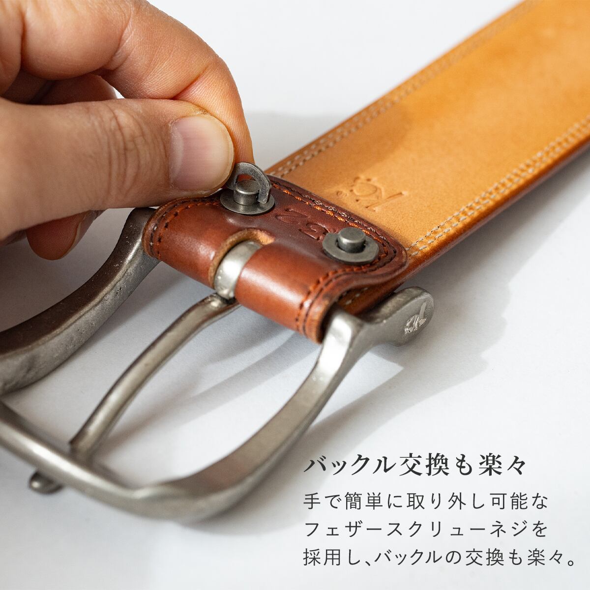 バックルには、簡単に着脱できるオリジナルパーツを採用。付属のブライドルバックルはもちろん、お手持ちのバックルや別売りパーツへの交換も可能です。コーディネートやシーンに応じて印象を変えられる、自由度の高い仕様となっています。