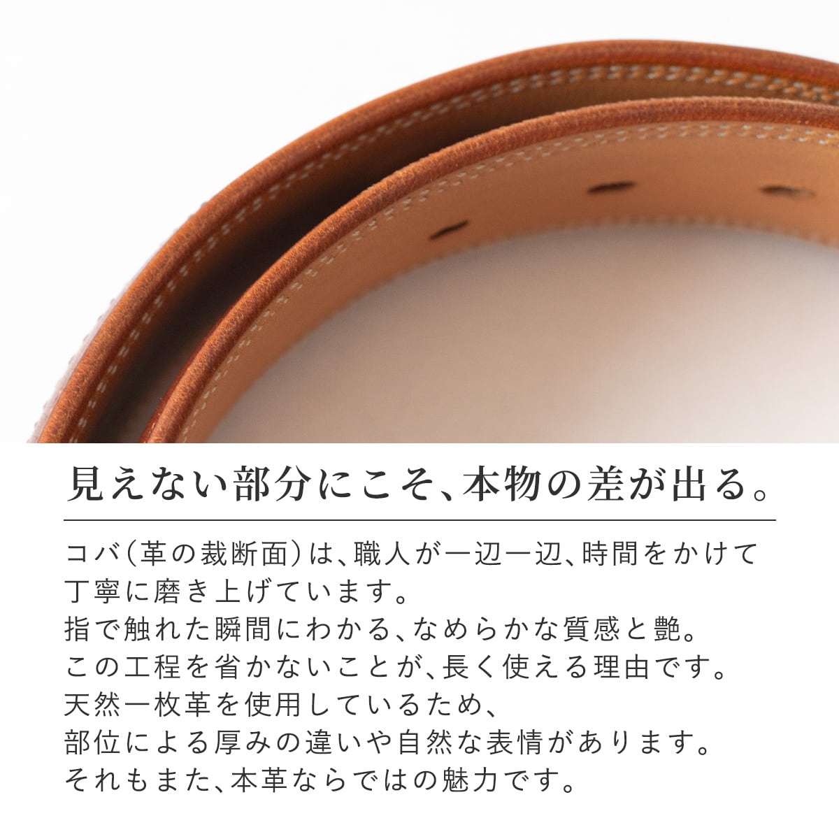 革3枚とクッション材1枚の合計4層構造により、優れた耐久性と快適な装着感を両立。断面(コバ)は職人の手で丁寧に丸く磨き上げられ、重ね合わせた革でありながら、まるで1枚革のような美しい一体感を演出します。長期間の使用にも耐える、実用性と美観を兼ね備えた設計です。