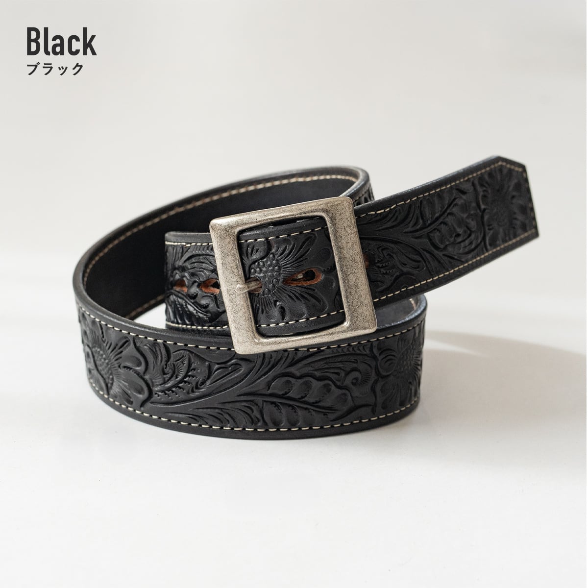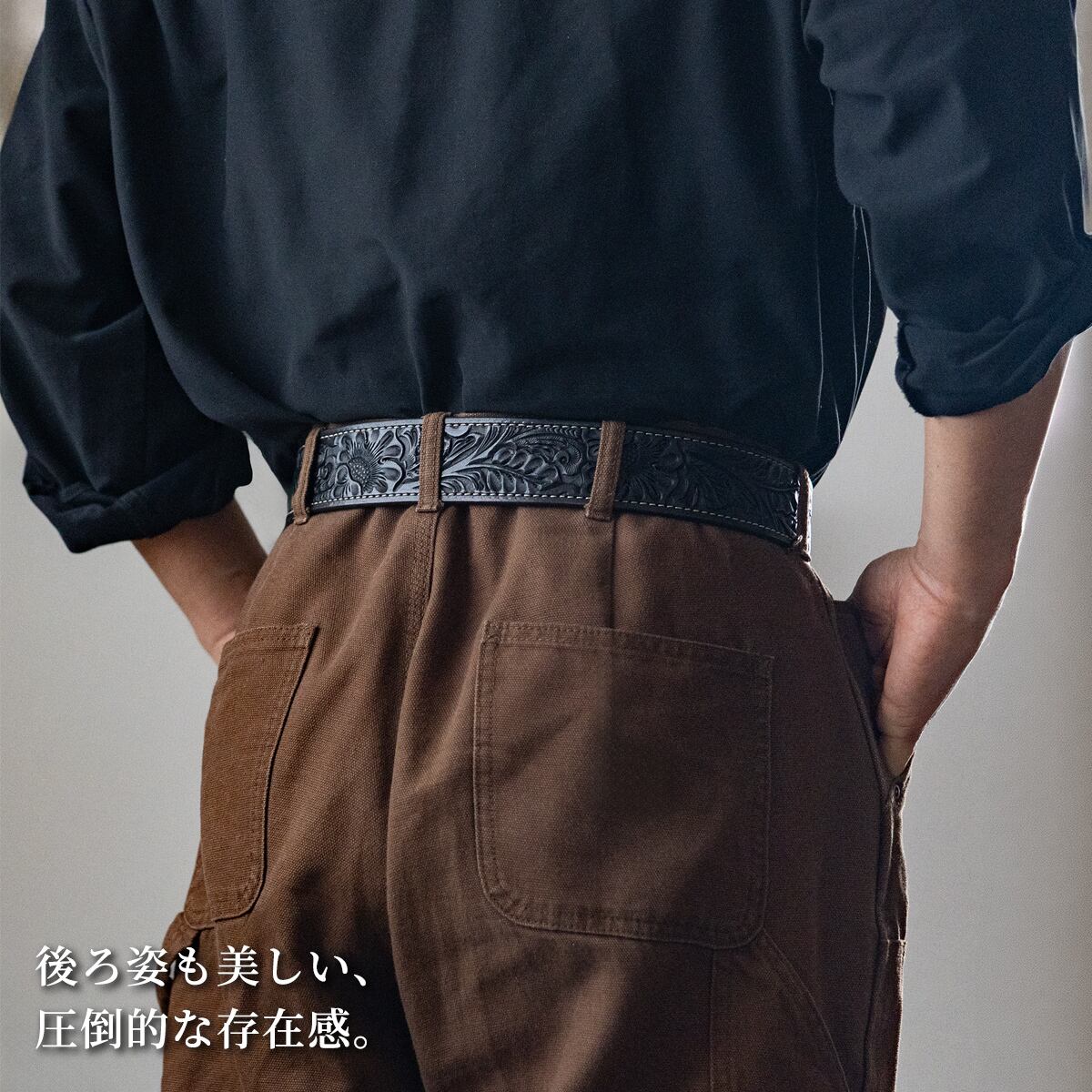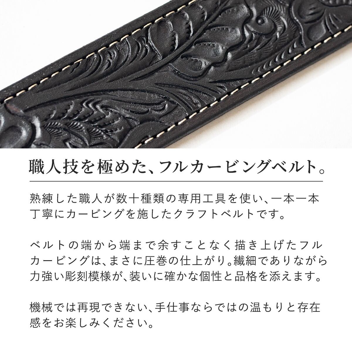 熟練した職人が数十種類の専用工具を使い、ベルト全体に丁寧なカービングを施したクラフトベルトです。端から端まで余すことなく描き上げたフルカービングの唐草模様は、圧巻の美しさと贅沢感を演出。一本ごとに異なる表情を持つ、まさに工芸品のような仕上がりです。