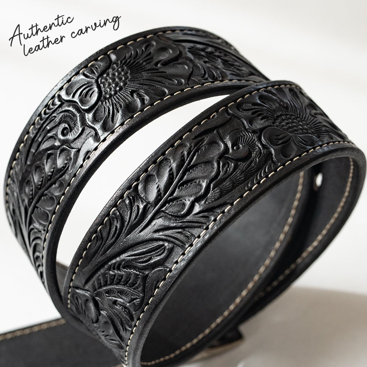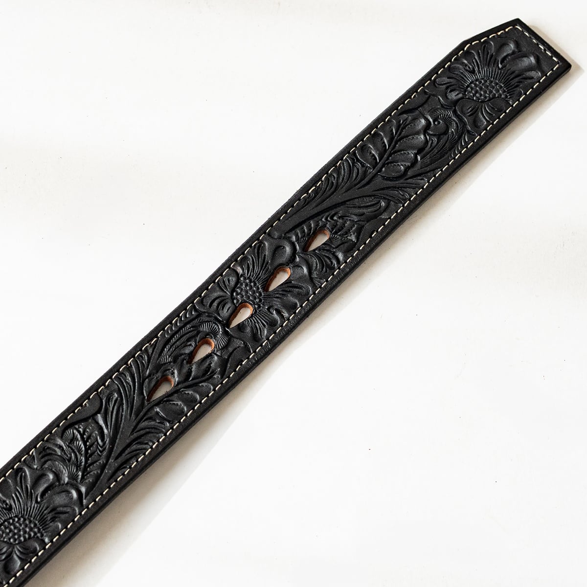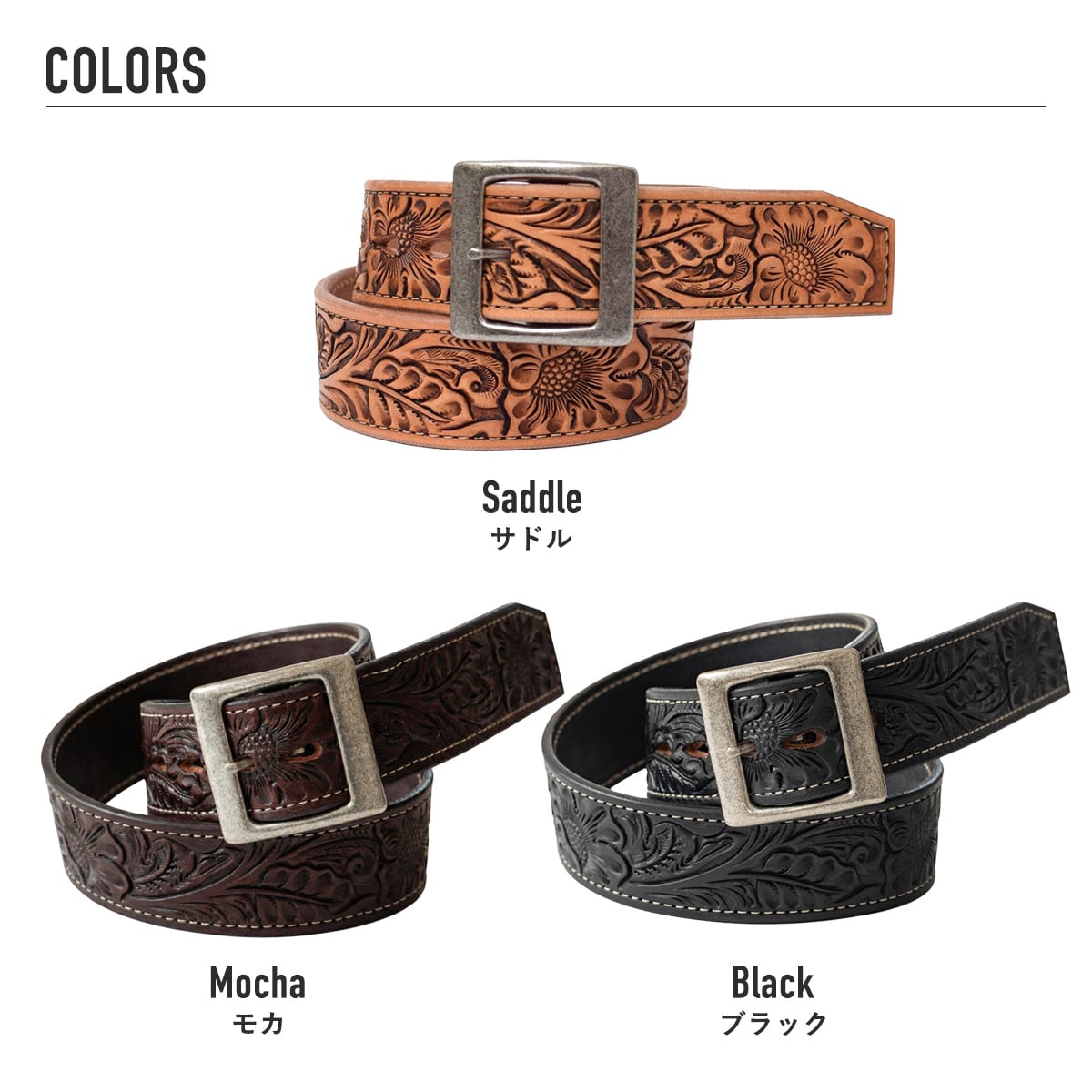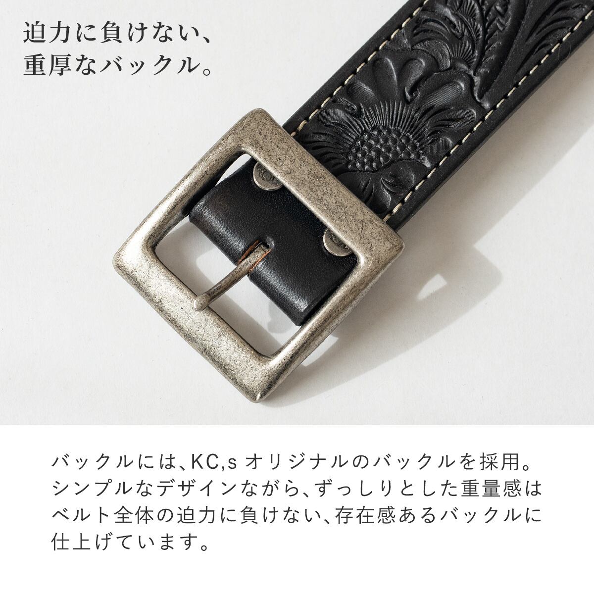 熟練した職人が数十種類の専用工具を使い、ベルト全体に丁寧なカービングを施したクラフトベルトです。端から端まで余すことなく描き上げたフルカービングの唐草模様は、圧巻の美しさと贅沢感を演出。一本ごとに異なる表情を持つ、まさに工芸品のような仕上がりです。
