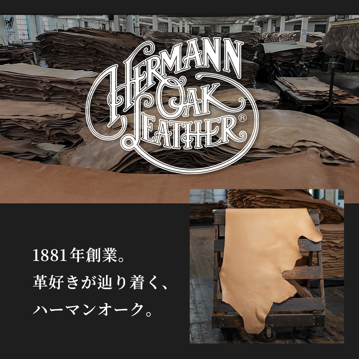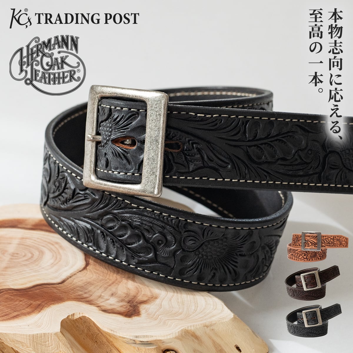 スーベルカッターとスタンプツールを用い、職人が先端から剣先まで手作業で唐草模様を刻み込んだ、こだわりのクラフトデザイン。ベルトの際縫いには#1番の国産スパン糸を使用し、味わい深い毛羽立ちのあるステッチを施しています。また、ベルト穴から剣先までの長さを通常より5.5cm長く設計し、連続する美しい柄を存分に楽しめる仕様。素材には、耐久性と経年変化に優れたハーマンオークレザーを採用しています。
