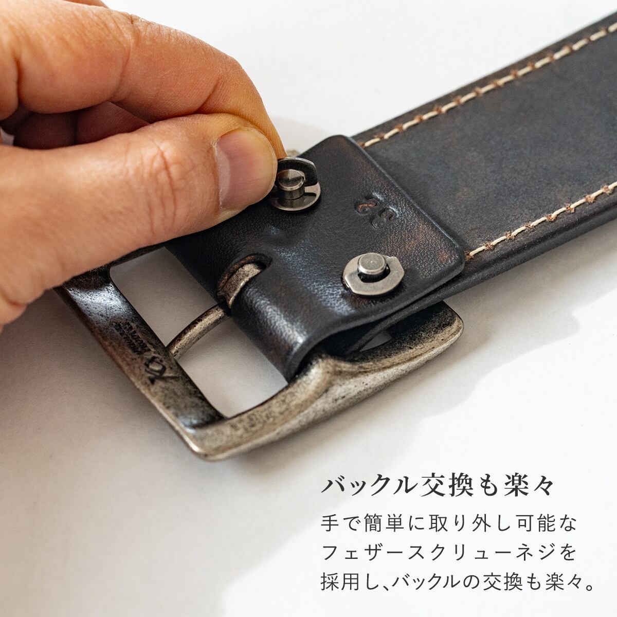 バックルにはオリジナルパーツを採用し、簡単に着脱できる仕様です。お手持ちのバックルへ交換したり、新しいデザインのバックルを組み合わせたりと、スタイルや用途に応じたカスタマイズが可能。一本で複数の表情を楽しめる、自由度の高い設計です。