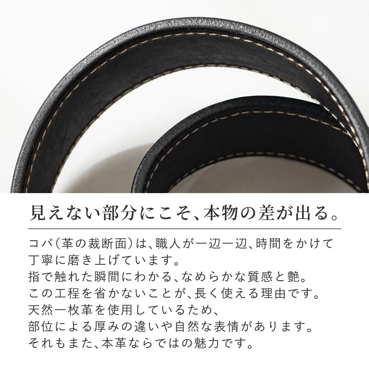 幅45mmのワイド設計と厚みのある牛革が、腰元に力強い存在感をもたらします。重厚感がありながらも、使い込むほどに革は柔らかくなり、身体に馴染んでいくのが特長。経年変化によって深まる風合いも、長く愛用できる魅力のひとつです。