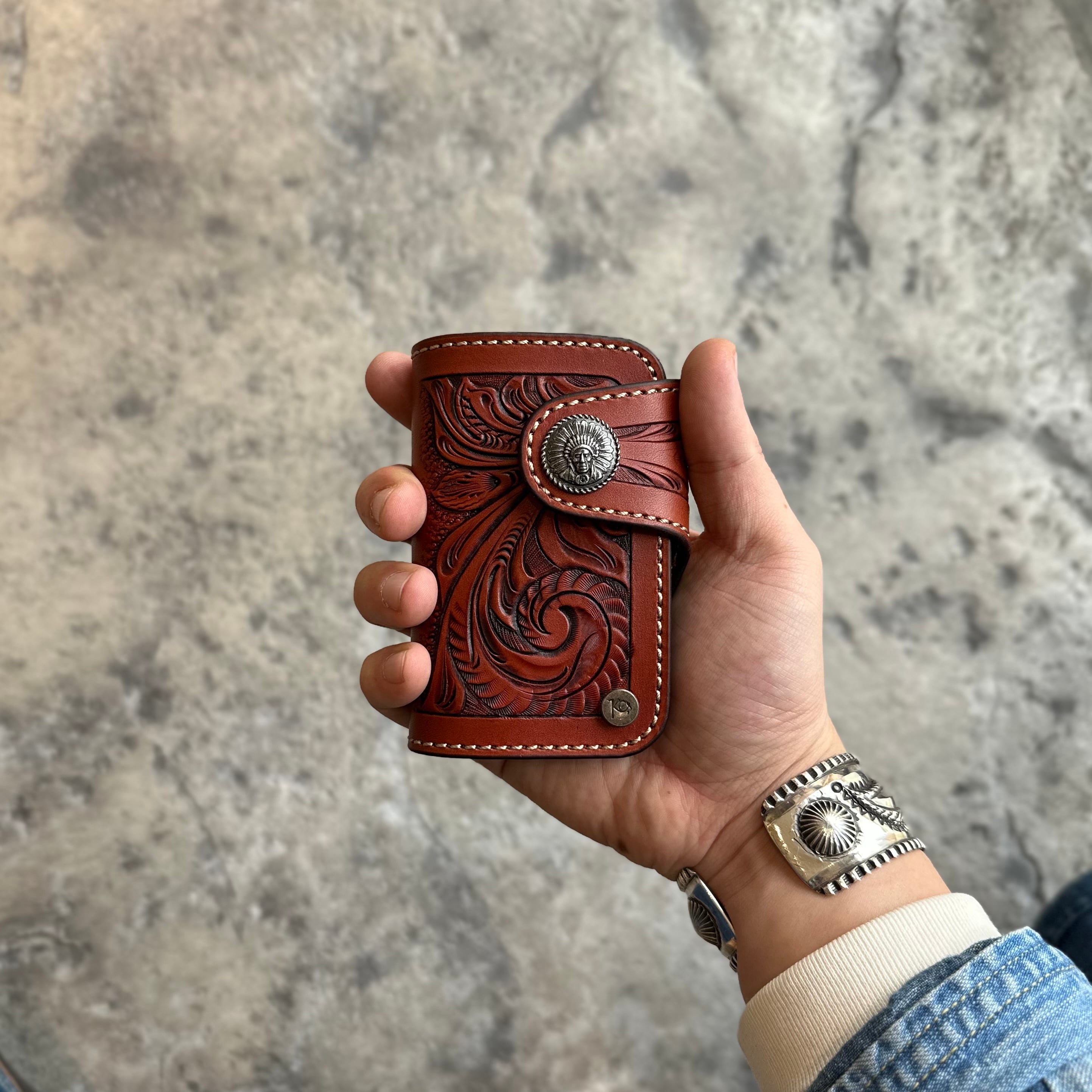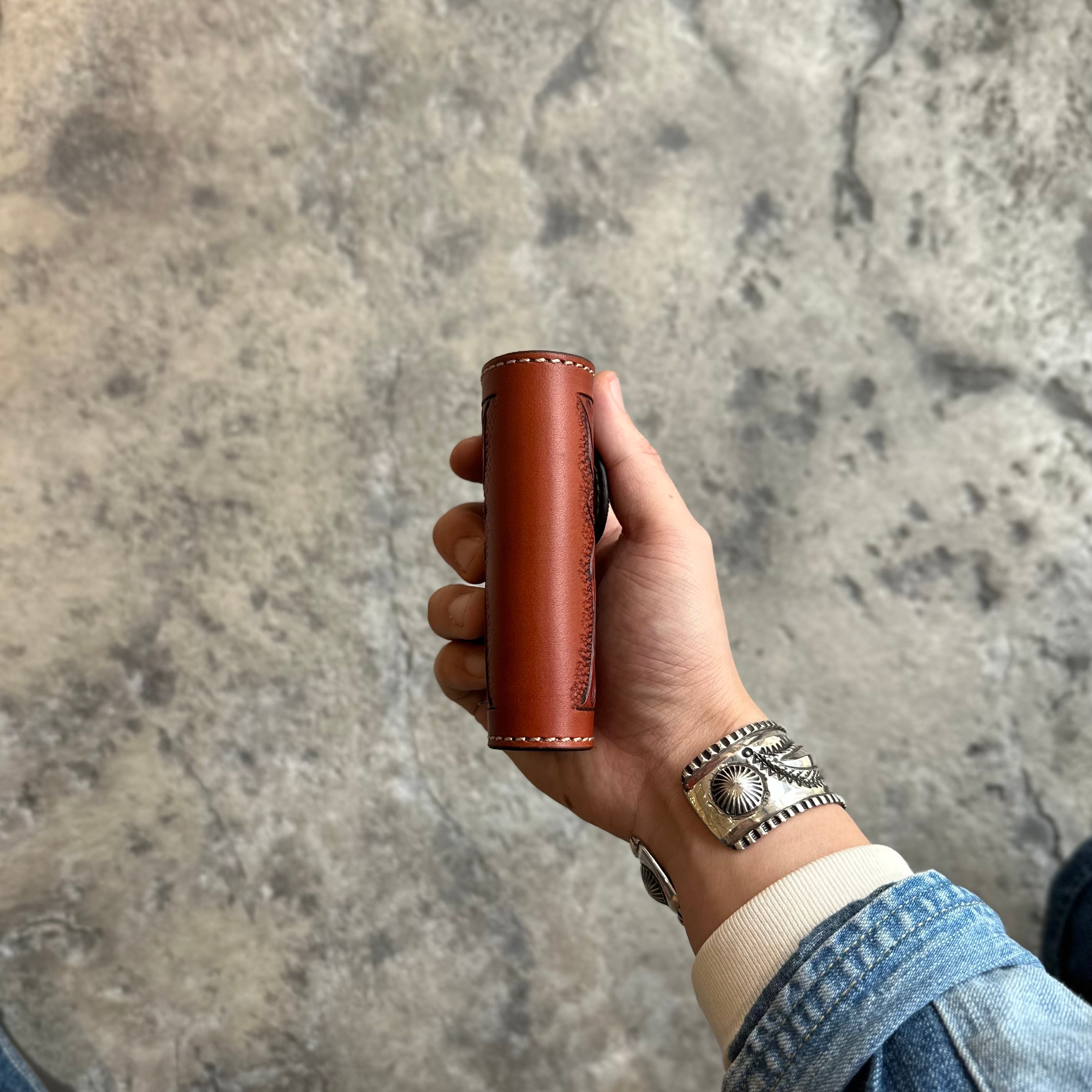 本体の図柄は革を湿らせ、フローラル柄の彫刻を施します。