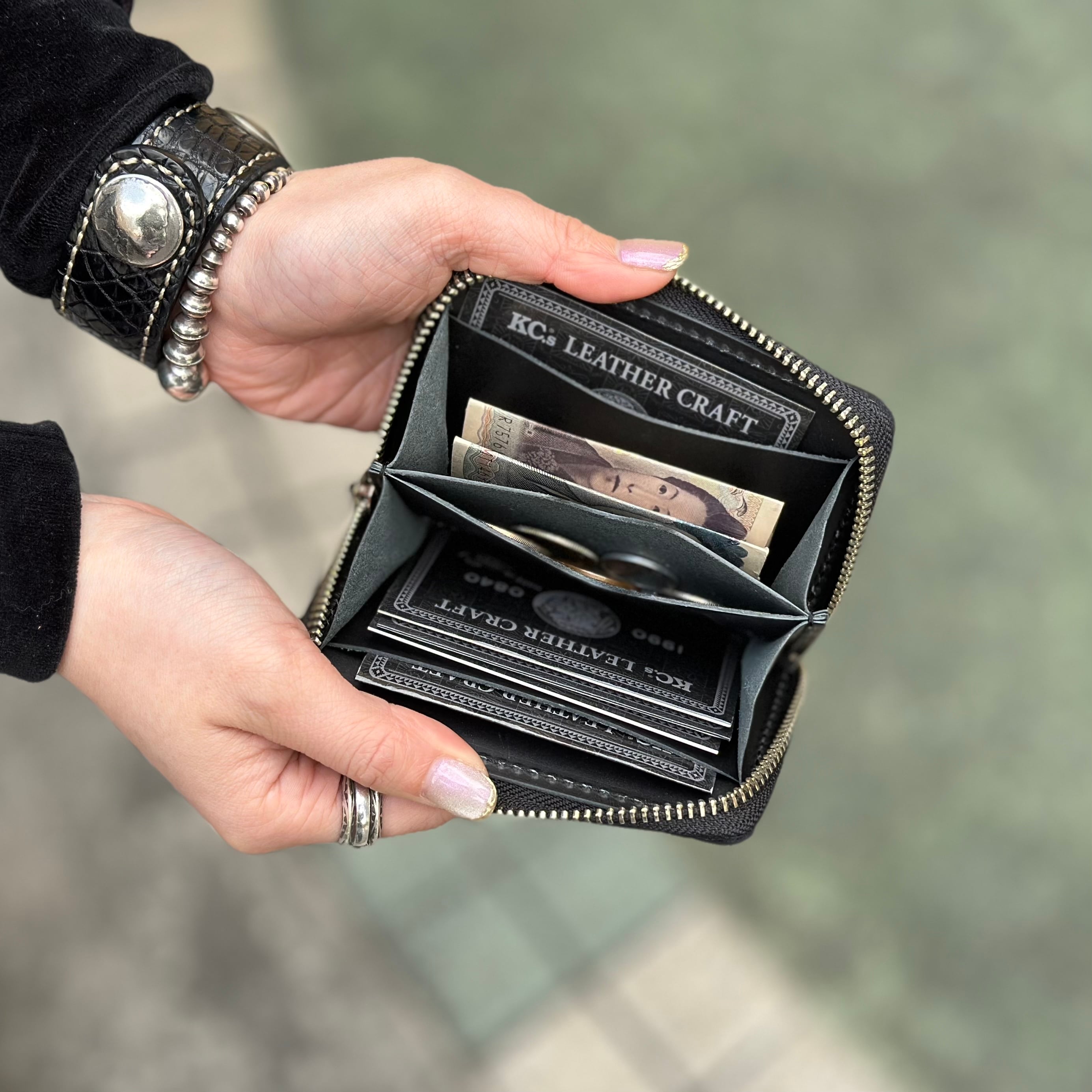 3つ折りしたお札や小銭、様々なカード類を収容することが出来ます。