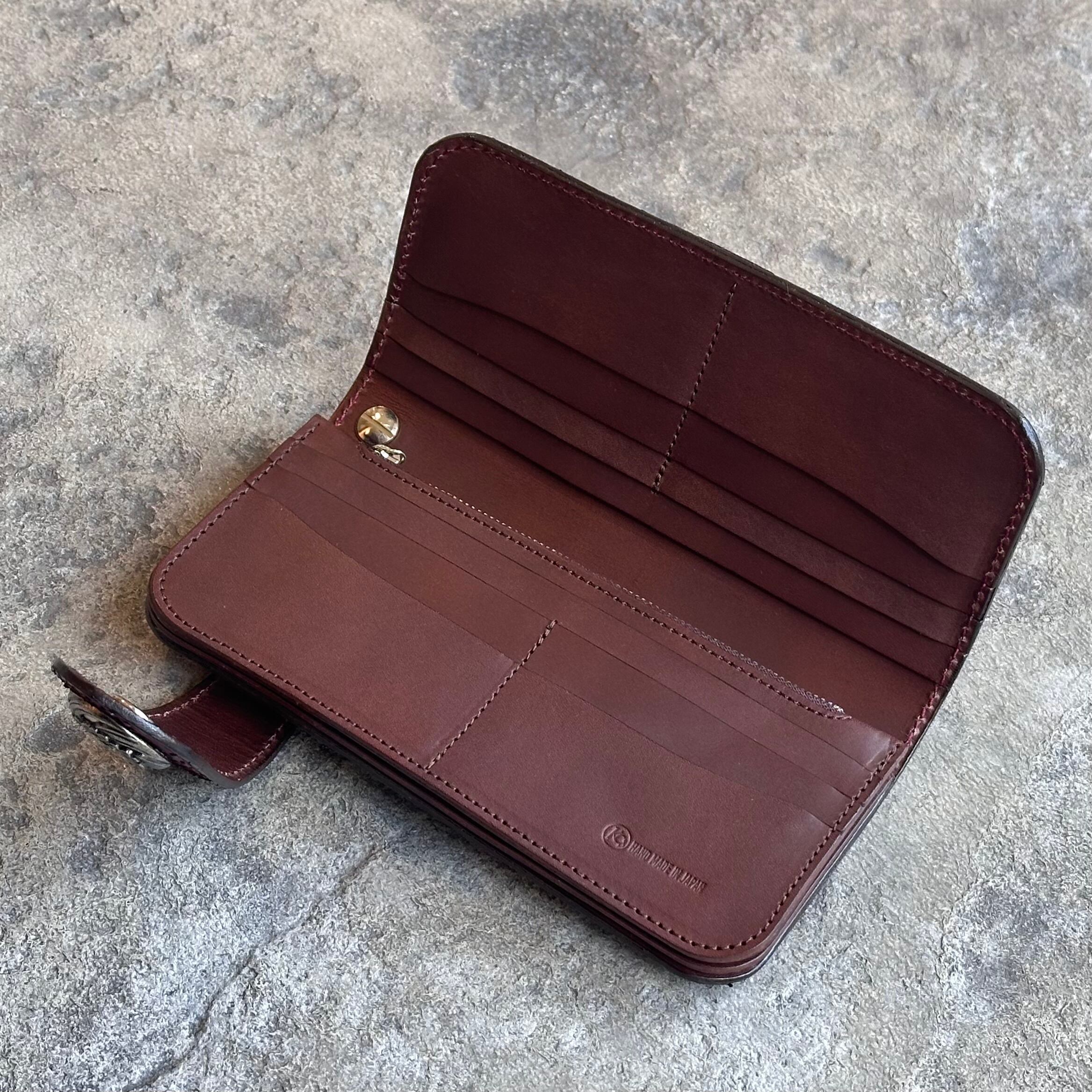 定番のライダースウォレットフォルムに、花模様を施したフローラルコンチョを組み合わせています。