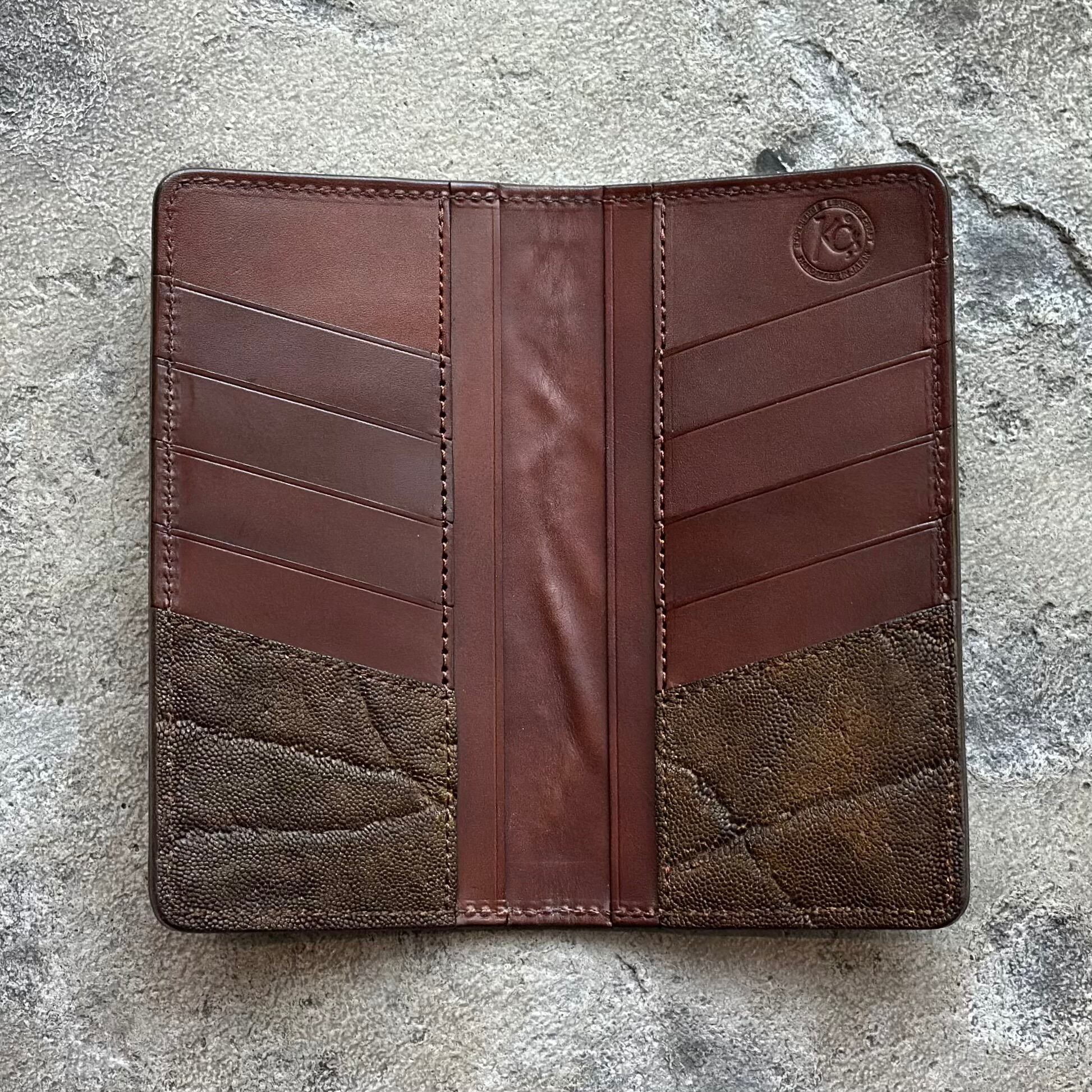 手染めならではの色ムラや革の光沢は通常のエレファント革とは一線を画す仕上がり。